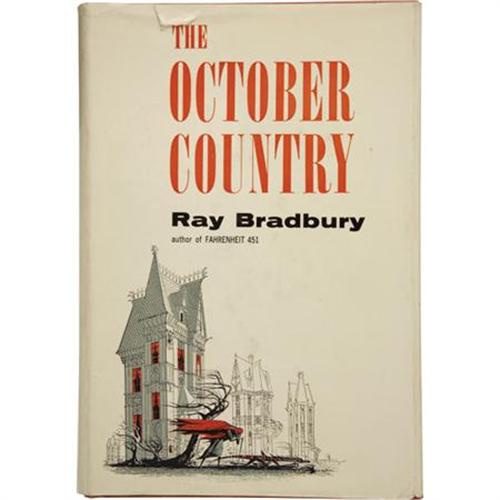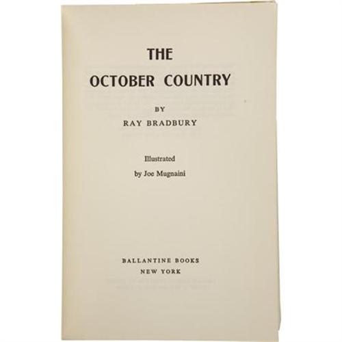 <B>Ray Bradbury. </B></I><B><I>The October Country</B></I></B></I><B>.</B></I> New York: Ballentine Book, [1955]. <BR> <BR>First edition (Currey binding C). Octavo. 306 pages. Illustrated by Joseph Mugnaini.<BR><BR>Publisher's glossy red cloth with black lettering on spine. Minor shelf wear to spine ends; board corners are firm and sharp. Neat bookplate of a former owner affixed to initial pastedown (covered by dust jacket). Textblock is in fine condition. Dust jacket has a .5 inch tear near head of spine, slightly affecting the "<I>The</B></I>" of the title, and two small water stains on verso at corners. Spine of jacket is significantly faded. A very good copy of a Bradbury classic.<BR><BR>Special issue of Bradbury's short story collection which reprints 15 stories from Bradbury's 1947 collection <I>Dark Carnival </B></I>and adds four others previously published elsewhere. <I>From the Robert and Diane Yaspan Collection.</B></I><BR><BR><b>Shipping:</b> Books & Catalogs (<a target="_blank" href="http://www.heritageauctions.com/common/shipping.php">view shipping information</a>)