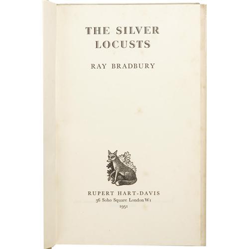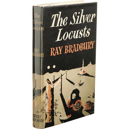 <B>Ray Bradbury: <I>The Silver Locusts</B></I>.</B></I> (London: Rupert Hart-Davis, 1951), first edition, 232 pages, light gray cloth with silver lettering on spine, 8vo (5" x 8.25"), dust jacket (in protective Mylar). Jacket illustration by Roy Sanford. This British edition of Bradbury's <I>The Martian Chronicles</B></I> was published a year after Bradbury's groundbreaking collection was published in the United States. The story "Usher II" was taken out of this release and replaced with "The Fire Balloons." This copy is in fine condition, with light foxing to the text edges, a few pages at the front and back, and the dust jacket as the only flaw. The binding is tight. An essential volume for the Bradbury completist. <I>From the Ventura Collection.</B></I><BR><BR><b>Shipping:</b> Books & Catalogs (<a target="_blank" href="http://www.heritageauctions.com/common/shipping.php">view shipping information</a>)