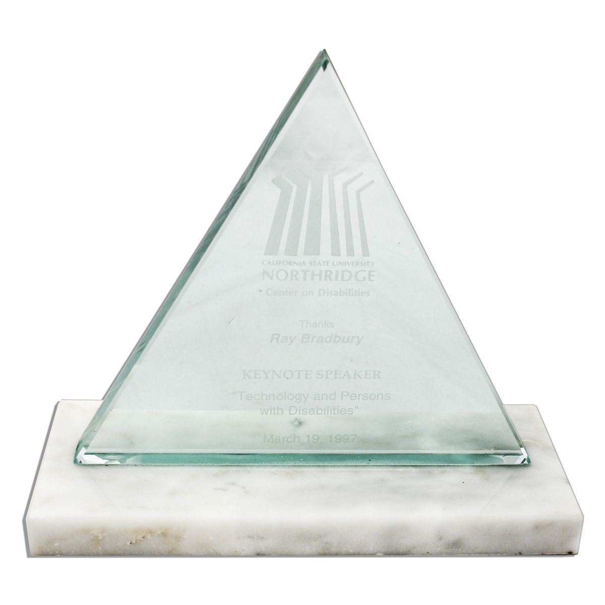 Ray Bradbury's award from the Center on Disabilities at California State University - Northridge. Trophy is a beveled glass triangle etched with the name of the award and Bradbury's name as Keynote Speaker on ''Technology and Persons with Disabilities'' at an event held 19 March 1997. Mounted to a white Italian marble base with sticker of fine marble made in Italy. Measures 9'' x 8'' x 3.5''. Weighs 4 pounds, 5 ounces. Near fine. With a COA from the Ray Bradbury estate.