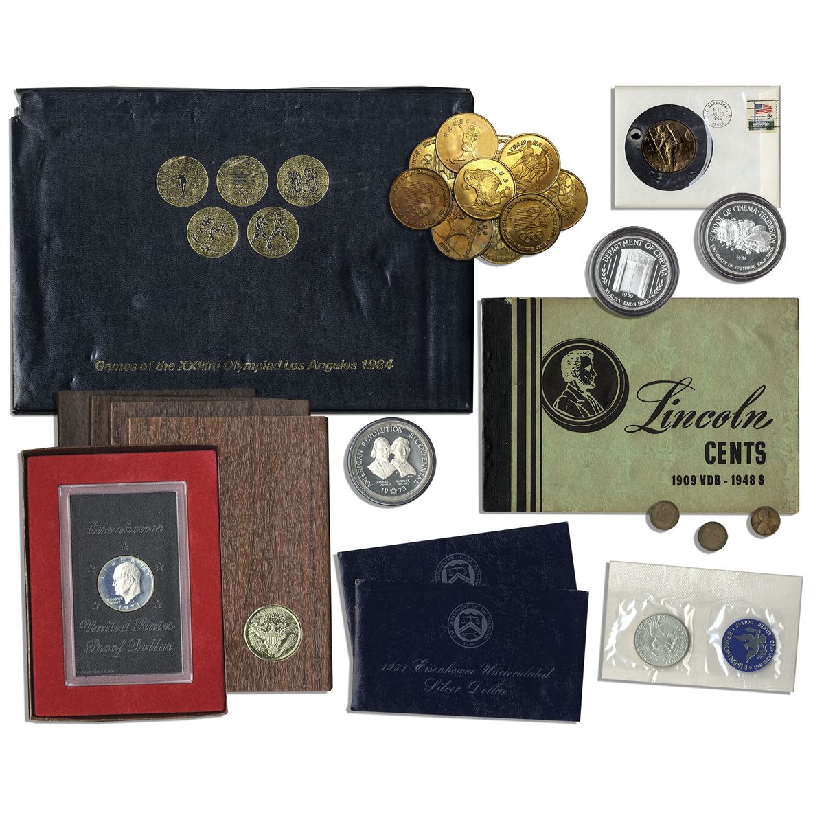 Ray Bradbury's personal coin collection. Nice assortment comprises: (1) an encapsulated 1973 American Revolution bicentennial commemorative sterling silver medal featuring busts of Samuel Adams and Patrick Henry in mint condition; (2) pair of encapsulated .999 fine silver coins from the USC School of Cinema-Television. Proof set is one of a limited edition of 250 sets, with coins weighing one troy ounce each. Mint; (3) pair of uncirculated silver Eisenhower dollar coins, each housed in a transparent sealed packet with a plastic COA medallion, COA card indicating 40% silver and original envelope from the Department of the Treasury; (4) Man-on-the-Moon medal by 99 Enterprises, originators of Certified Coins and Medals with serial number 09663, accompanied by a first day Moon Landing cover. Mint; (5) collection of 21 different transit tokens from the Games of the XXIII Olympics, held in Los Angeles in 1984. Each token features a different Olympic event as designed by N. Neil Haris: Archery, Baseball, Basketball, Boxing, Cycling, Equestrian, Fencing, Field Hockey, Gymnastics, Judo, Pentathlon, Rowing, Shooting, Soccer, Swimming, Team Handball, Track & Field, Volleyball, Weight Lifting, Wrestling, and Yachting. Minted in alloy metal by the Southern California Rapid Transit District (SCRTD). Bradbury has amassed 21 of the 24 different designs. Some tarnishing and scratching from use; (6) collection of 5 Eisenhower proof dollars, each housed in its original faux-wood paper case with gilt Presidential seal. Mint; (7) book of Lincoln cents, labeled 1909 VDB-1948 S. Filled with 25 different cents. With a COA from the Ray Bradbury estate.