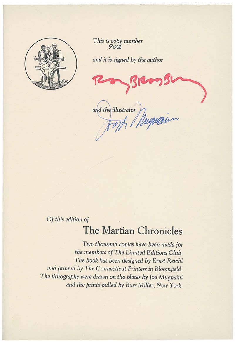 Signed book: The Martian Chronicles. Limited edition of 2000 copies (This being No. 902). Connecticut: Limited Editions Club, 1974. Hardcover with slipcase, 7.75 x 10.75, 309 pages. Signed on the colophon page in red felt tip by Bradbury and also signed in blue i\nk by illustrator Joseph Mugnaini. In fine condition, with one separated edge to slipcase, as well as some other scattered edge wear.