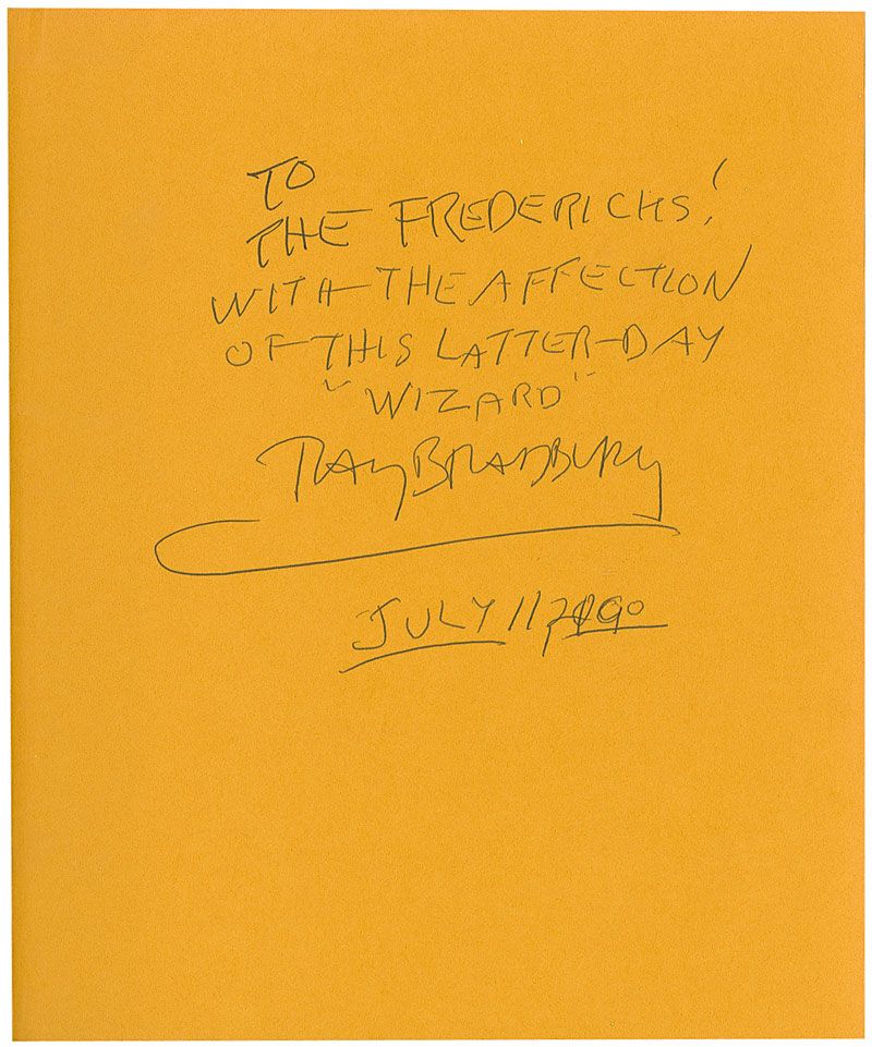 Signed book: The Wonderful Wizard of Oz. First edition, first printing. Kansas: University of Kansas Press, 1999. Hardcover with dustjacket, 7.25 x 9, 187 pages. Signed and inscribed on the first free-end page, “To the Fredericks! With the affection of this latter-day Wizard, Ray Bradbury, July 11, 2000.” In fine condition.