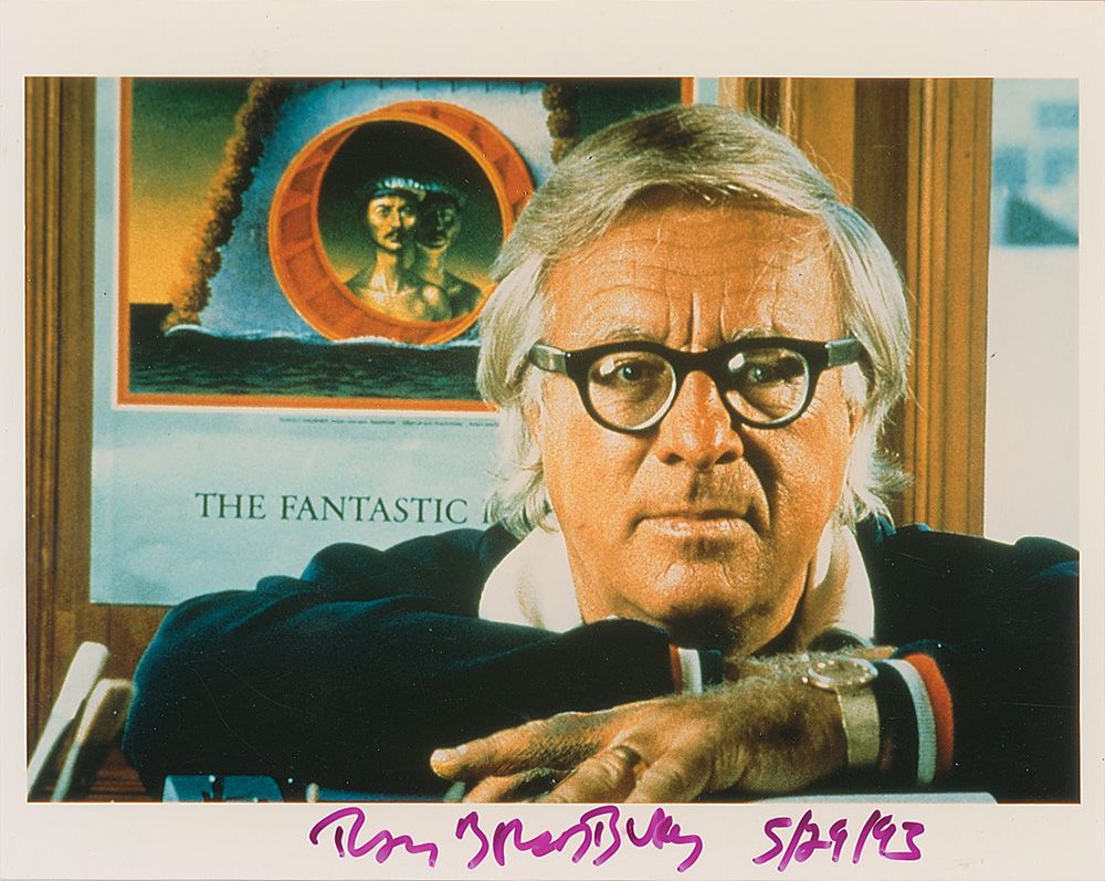Color glossy 10 x 8 photo of Bradbury, signed in purple felt tip, “Ray Bradbury, 5/29/93.” In fine condition, with slight brushing to a single letter of the signature.