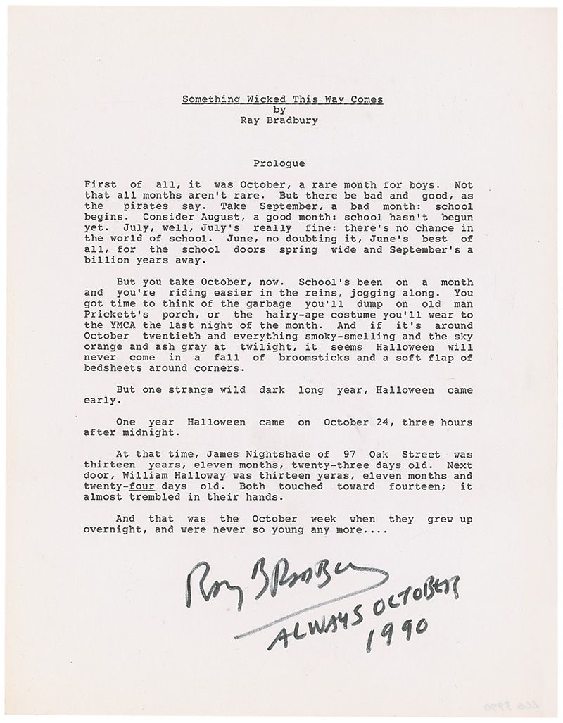Souvenir typescript, one page, 8.5 x 11, the prologue to ‘Something Wicked This Way Comes,’ signed at the bottom in black felt tip, “Ray Bradbury, Always October 1990.” In fine condition.