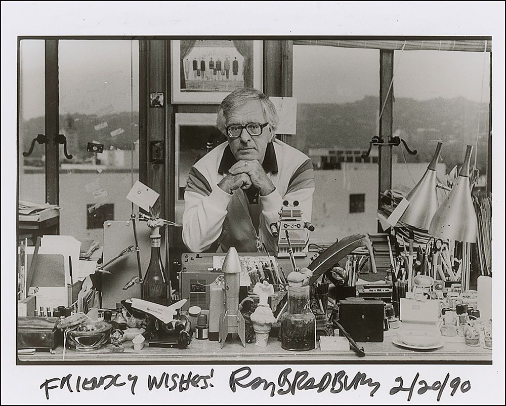 Glossy 10 x 8 photo of the author posing in front of a table full of memorabilia, signed in the lower border in black felt tip, “Friendly wishes! Ray Bradbury 2/20/90.” In very fine condition.