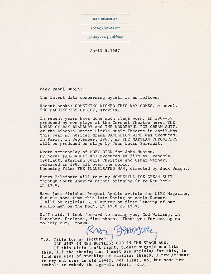 TLS, one page, 8.5 x 11, personal letterhead, April 5, 1967. Letter sending biographical information ahead of a speaking engagement. In part; “Have just finished Project Apollo article for Life magazine, due out some time this late Spring or early Summer.