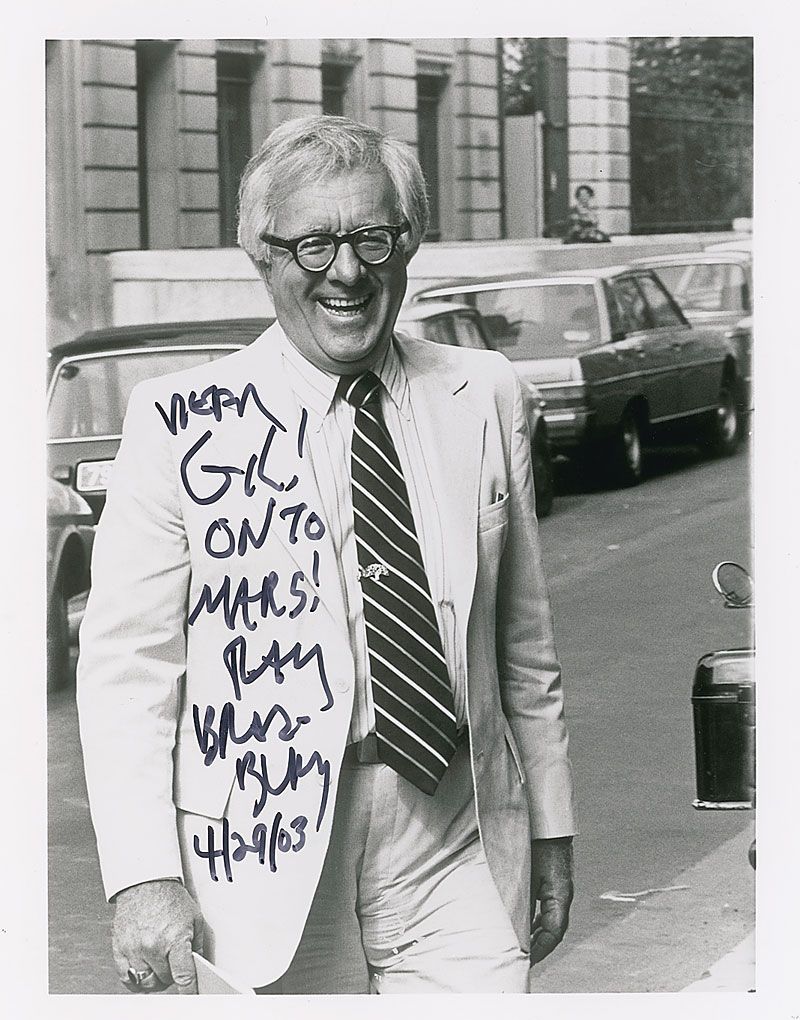 Glossy 8 x 10 photo of Bradbury crossing a street, signed and inscribed in black felt tip “Dear Gil! On to Mars! Ray Bradbury, 4/29/03.” In fine condition.