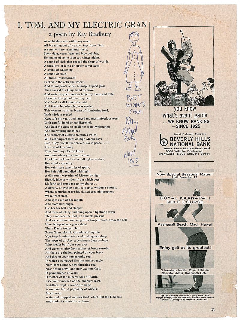 Original vintage signed ballpoint sketch of the character in his poem on a 9 x 12 magazine page featuring “I, Tom, and My Electric Gran,” signed in blue ballpoint, “Best wishes from Ray Bradbury, Nov. 1965.” In very good to fine condition, with some scattered creases, overall wrinkling, and a few tape-repaired edge tears (which could be matted out).