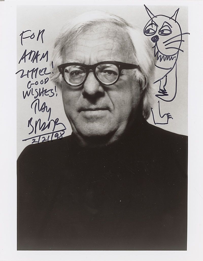 Glossy 8 x 10 photo, signed and inscribed in black felt tip, “For Adam Zittez! Good wishes! Ray Bradbury 2/21/98,” with Bradbury adding a sketch of a cat-like monster behind his head. In fine condition.