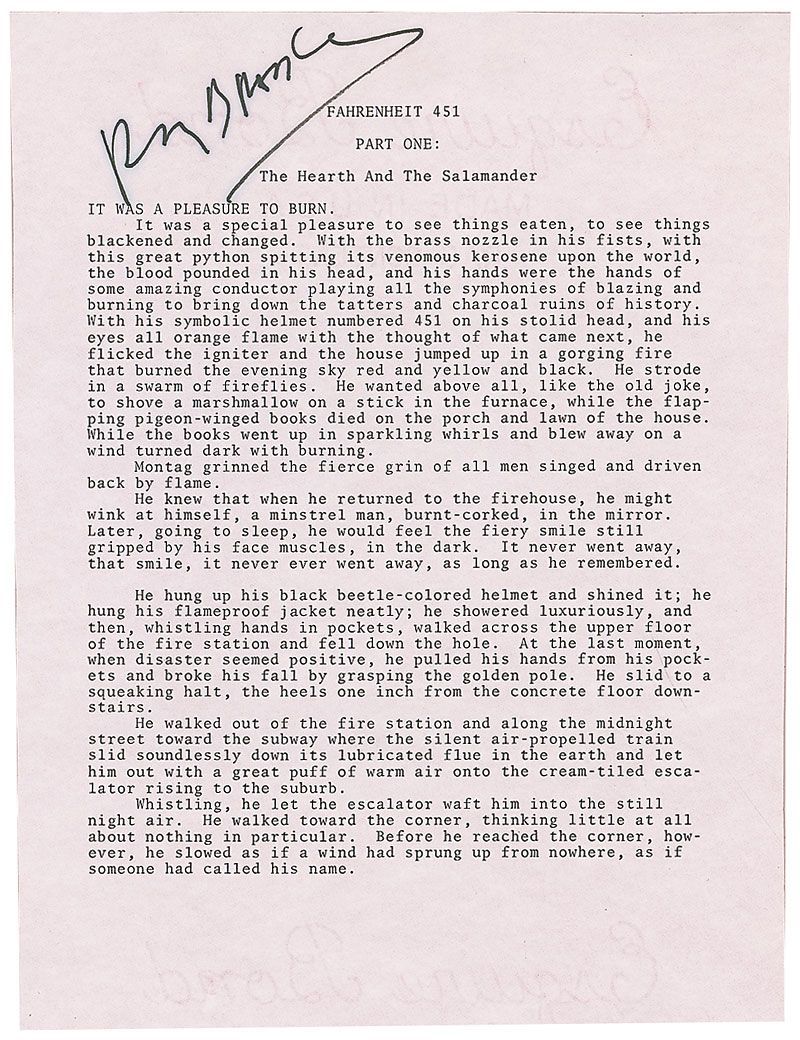 Souvenir typescript, one page, 8.5 x 11, from Part One of Fahrenheit 451, beginning: “It was a pleasure to burn. It was a special pleasure to see things eaten, to see things blackened and changed.” Signed at the top in black felt tip by Bradbury. Typescript is affixed by its top edge to an identical size sheet of red cardstock. In fine condition.
