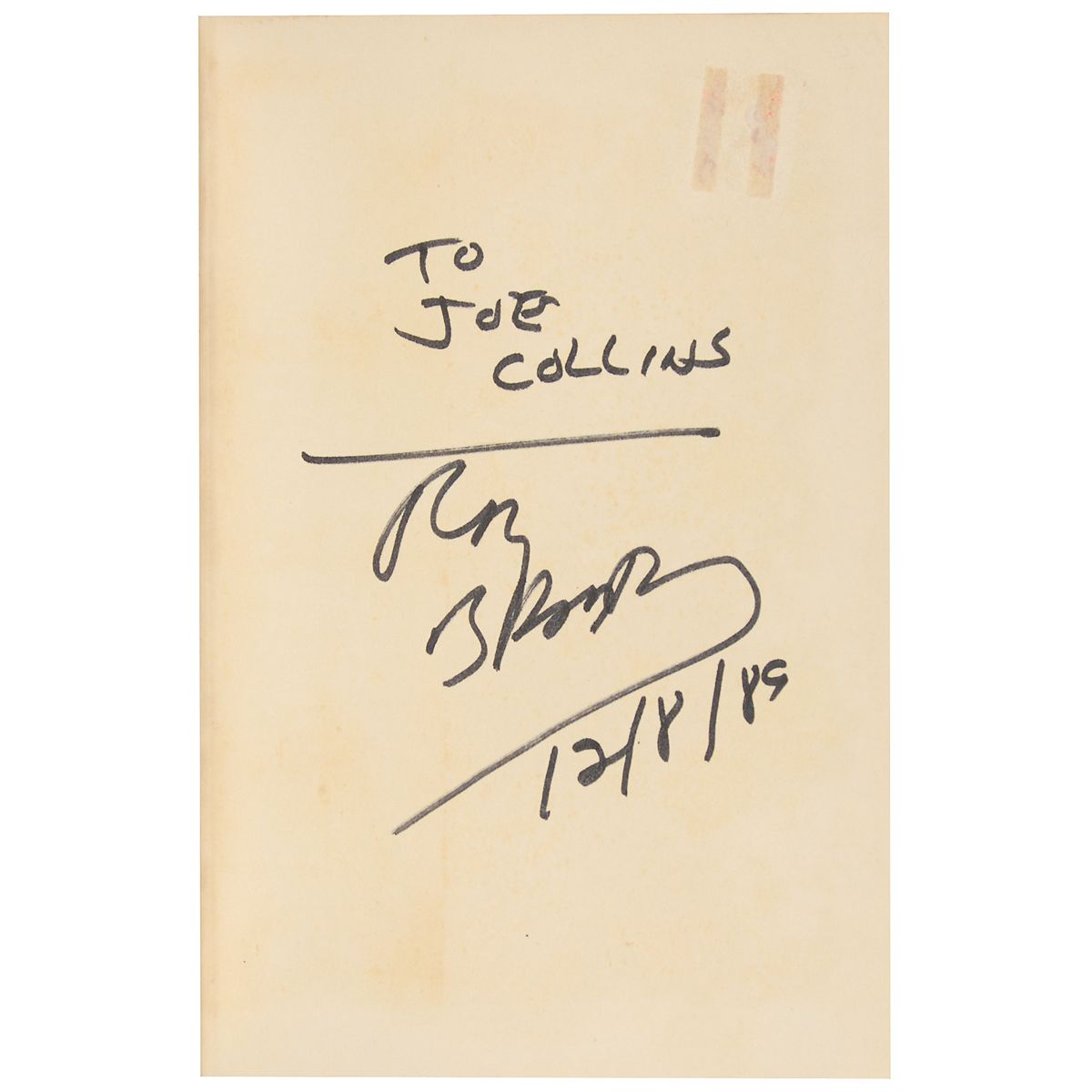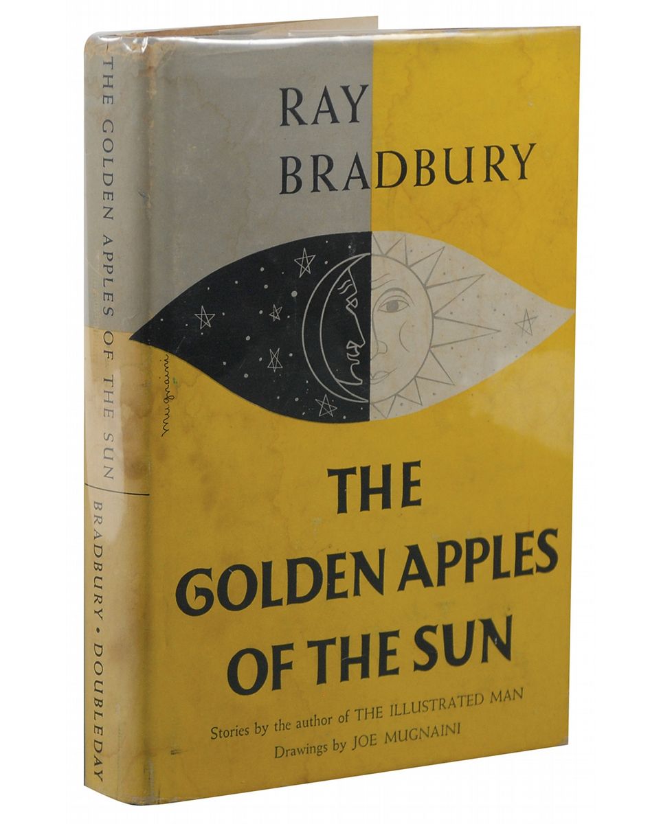 Signed book: The Golden Apples of the Sun. First edition. Garden City, NY: Doubleday, 1953. Hardcover with dust jacket, 5.5 x 8, 250 pages. Signed and inscribed later on the first free end page in black felt tip, “To Joe Collins, Ray Bradbury, 12/8/89.” In very good condition, with significant dampstaining to dust jacket, and adhesive remnants and overall toning to the signed page.