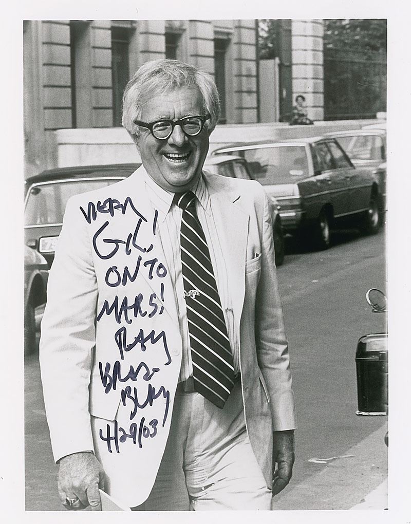 Glossy 8 x 10 photo of Bradbury crossing a street, signed and inscribed in black felt tip, “Dear Gil! On to Mars! Ray Bradbury, 4/29/03.” In fine condition.
