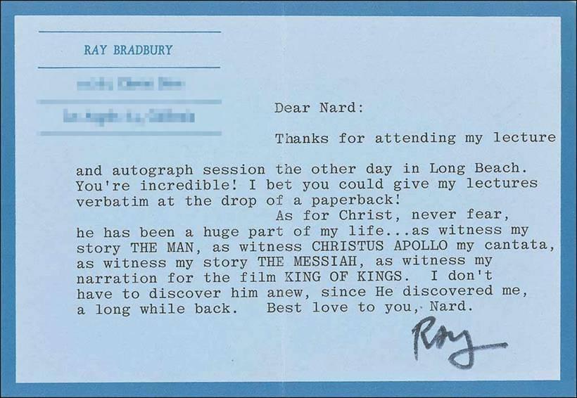 TLS signed “Ray,” one page, 6.5 x 4.5, personal letterhead, no date. Letter to his friend Nard. In part: “Thanks for attending my lecture and autograph session…As for Christ, never fear, he has been a huge part of my life…as witness my story The Man, as witness Christus Apollo my cantata, as witness my story The Messiah, as witness my narration for the film King of Kings. I don’t have to discover him anew, since He discovered me, a long while back.” In fine condition, with a bisecting vertical fold.