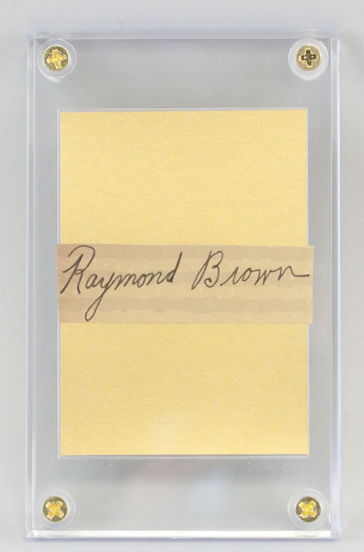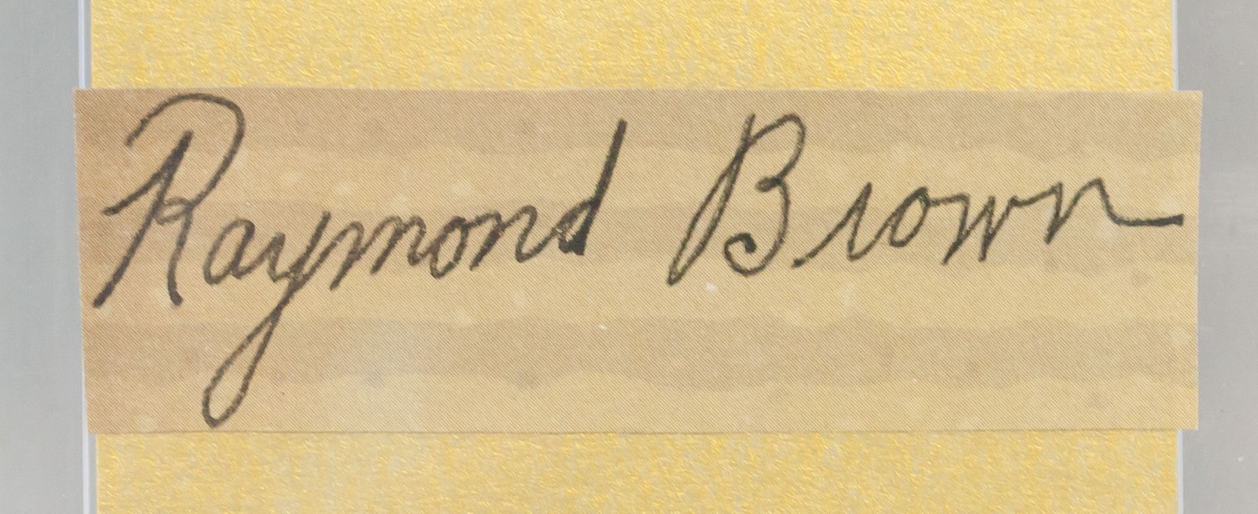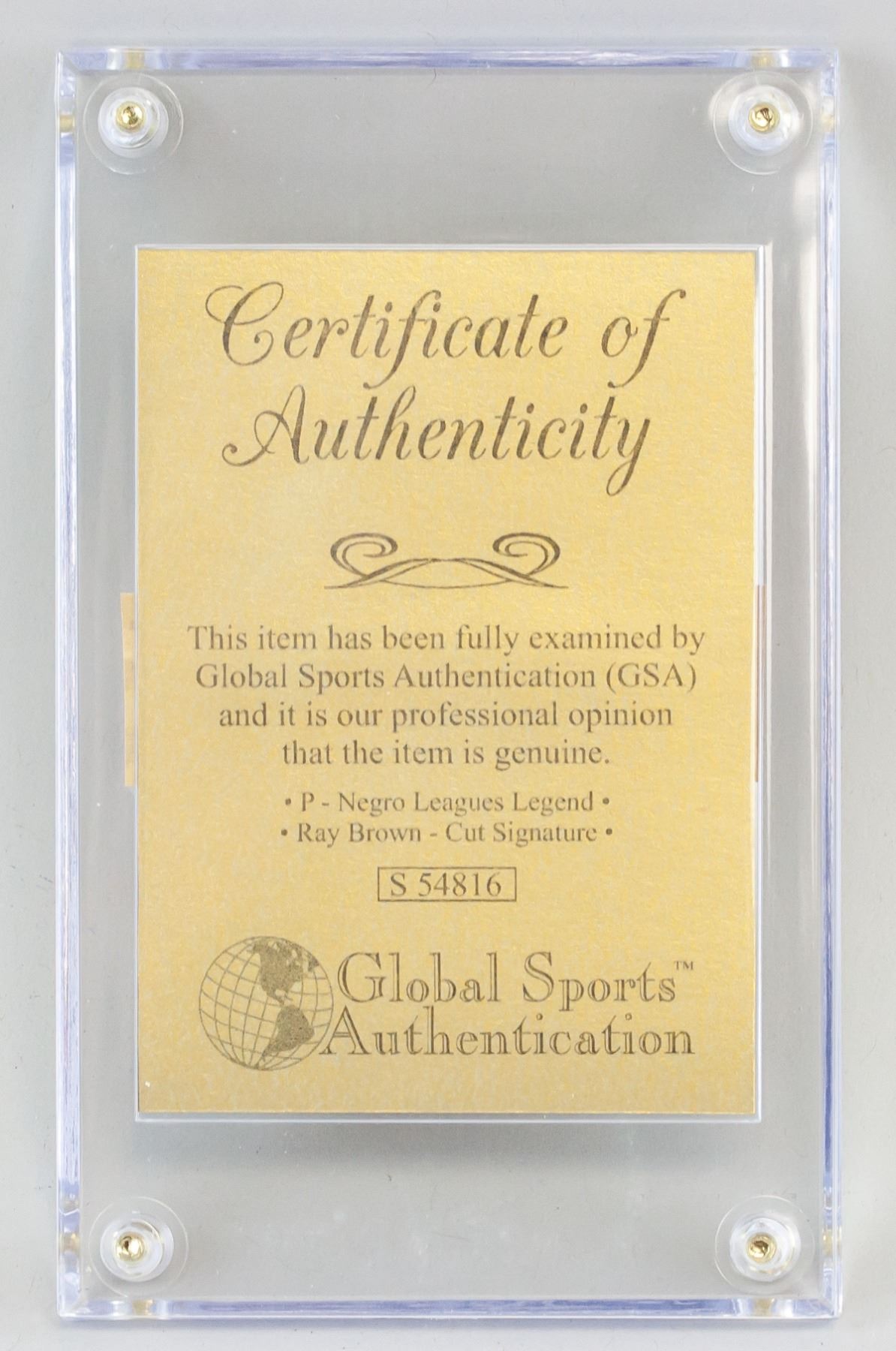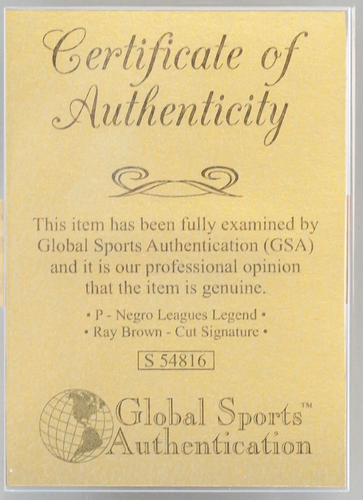 Raymond Brown autograph pressed between glass. Accompanied with Certificate of Authenticity. Raymond Brown was an American right-handed pitcher in Negro league baseball, almost exclusively for the Homestead Grays. During his career, he was widely considered the best pitcher in the Negro leagues at the time, and led the Grays to eight pennants in one nine-year span. 2 x 6.5 cm, case size: 13 x 8 cm. Photograph not included in the lot