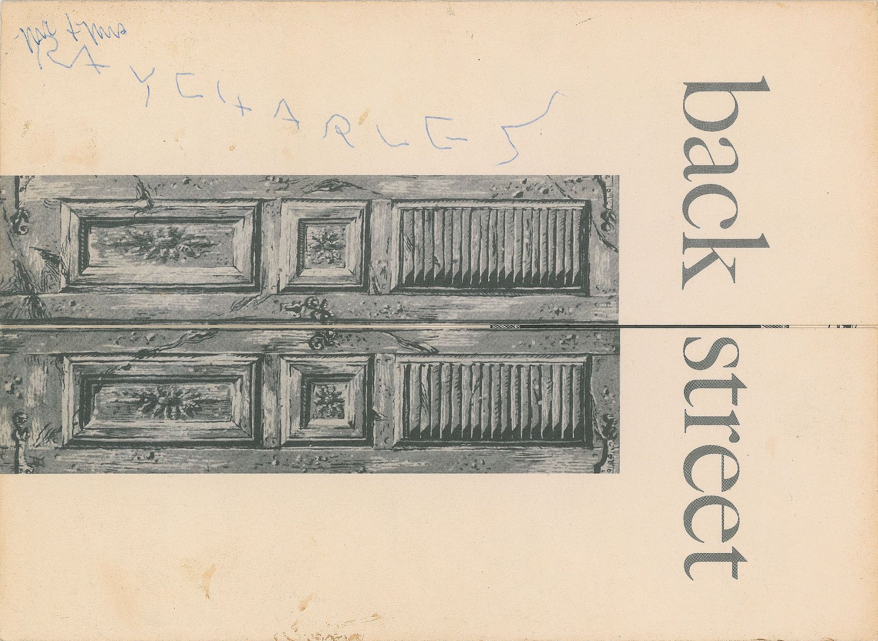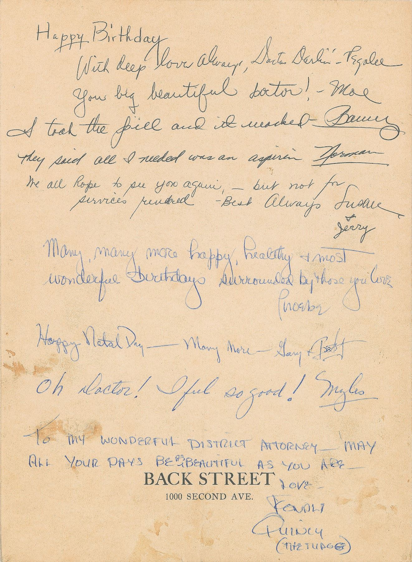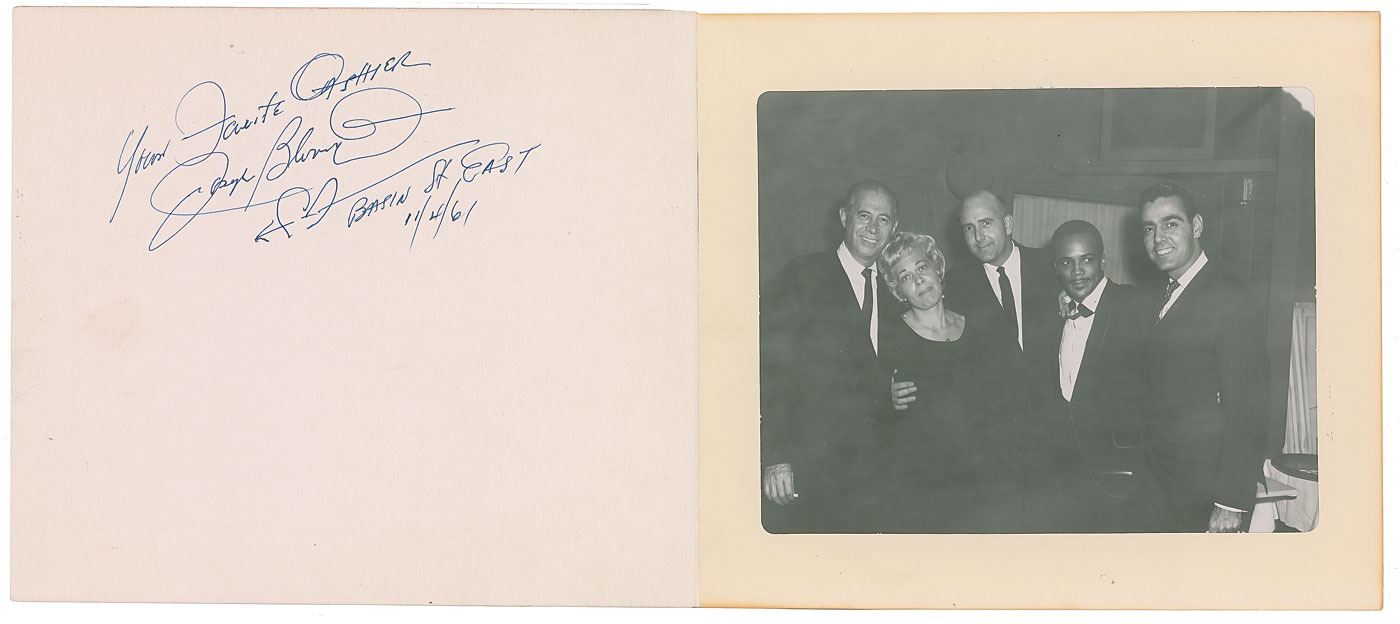 Vintage ballpoint signature, "Ray Charles," signed vertically on the front of an off-white 8 x 11 menu for New York's Back Street Restaurant; another hand has added "Mr. & Mrs." above the signature. Reverse of the menu is signed by several others, including jazz singer Peggy Lee, who writes, "Happy Birthday, with deep love always, Doctor Darlin," and by composer and musician Quincy Jones, who adds, "To my wonderful district attorney—may all your days be as beautiful as you are." In fine condition, with some light stains and general handling wear. Accompanied by a 6.5 x 10 program for a "Gala Premiere Dinner of Peggy Lee" at New York's Basin Street East nightclub on October 30, 1961, which lists Jones as the musical director; and an 11 x 9.5 Basin Street East photo holder, which houses a glossy photo of Jones posing with four people at Lee's dinner event, one of whom is the recipient of the menu, Dr. Robert Walter. After playing the Jazz a Juan Festival in Antibes earlier that summer, Charles and his troupe returned to Europe and France in mid-October 1961 to much anticipation. Shows in Zurich and Lyon were followed by a series of seven shows at the Palais des Sports in Paris between October 20 and 24, with the wildly popular concerts attracting record-breaking totals of nearly 35,000 people. Given that Charles's aides nearly always signed on his behalf, or at best guided his hand, authentic signatures from Charles, such as this one, are virtually nonexistent.