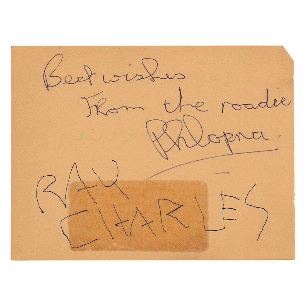 Scarce vintage ink signature, "Ray Charles,†on a beige 6.25 x 4.75 album page. In very good to fine condition, with a rectangular stain touching most of the signature. Charles remains extremely rare in authentic material.