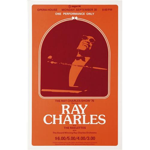 <B>Ray Charles Spokane Opera House Concert Poster (Expo '74, 1974).</B></I> Brother Ray holds his head high on this marvelous concert poster for a show in 1974. Mr. Charles certainly looks resplendent in his tux and shades! The poster measures 14" x 22" and is in Near Mint condition.