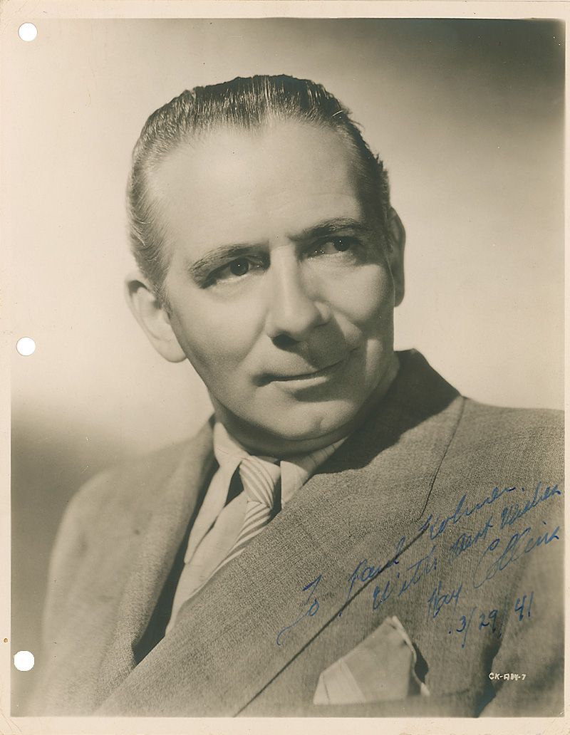 Film, stage, radio, and television actor (1889–1965), he played Lieutenant Tragg in the long-running Perry Mason TV series. Vintage matte-finish 7.75 x 10 head-and-shoulders photo, signed and inscribed in fountain pen “To Paul T. Colmen, with best wishes, Ray Collins 3/29/41.” In very good condition, with some corner tip creasing, slight silvering, light rippling to top and bottom edges, three punch holes to left side, and a trimmed right edge.