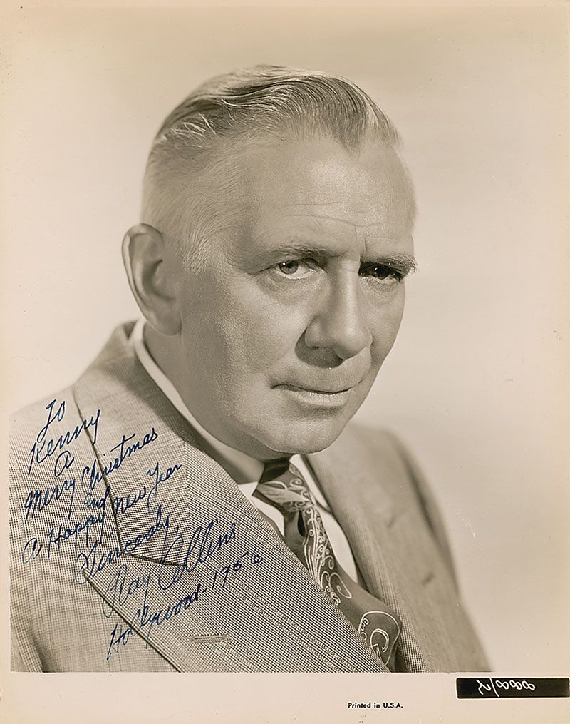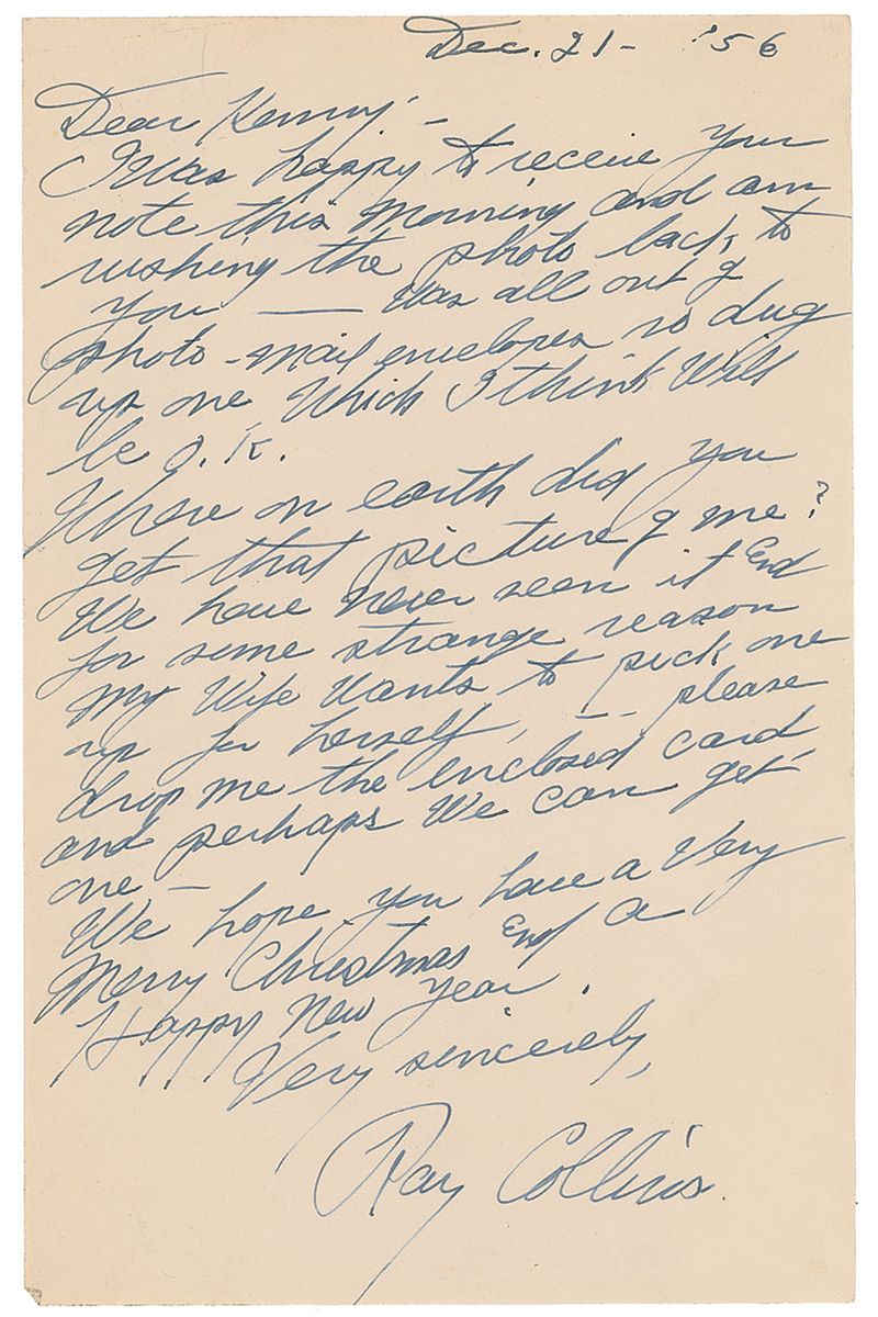 Film, stage, radio, and television actor (1889–1965), he played Lieutenant Tragg in the long-running Perry Mason TV series. Vintage glossy 7.75 x 9.75 head-and-shoulders photo of Collins, signed and inscribed in fountain pen, “To Kenny, a Merry Christmas and a Happy New Year. Sincerely, Ray Collins, Hollywood, 1956”; and an ALS, one page, 5.75 x 9, December 21, 1956, in part: “Where on earth did you get that picture of me? We have never seen it and for some strange reason my wife wants to pick one up for herself—please drop me the enclosed card and perhaps we can get one.” In overall fine condition, with a few creases and roughly trimmed right edge to the photo.