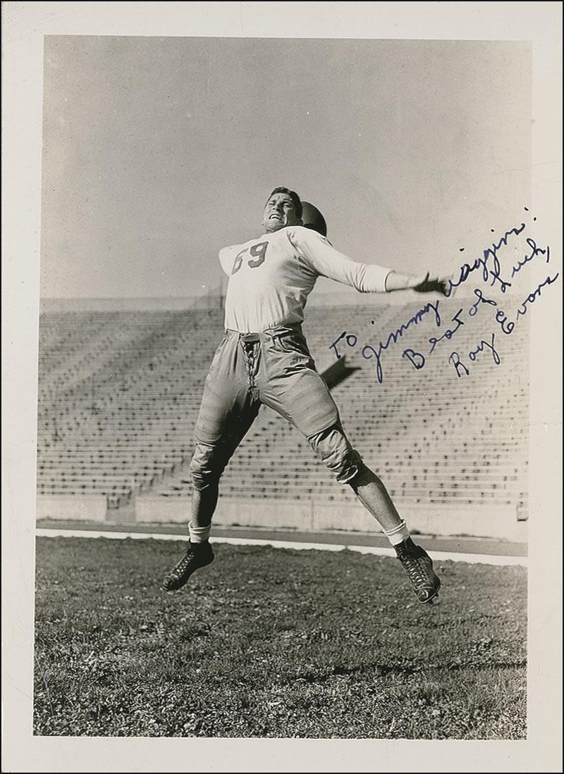 College Football Hall of Famer (1922–1999) and multi-sports star at Kansas. Vintage glossy 5 x 7 photo of Evans in his Kansas uniform, signed and inscribed in fountain pen “To Jimmy Wiggins: Best of luck, Ray Evans.” In very good condition, with scattered creases and wrinkles, some affecting signature and inscription.