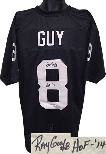 Ray Guy was a punter for the Oakland/Los Angeles Raiders. Coming from University of Southern Mississippi, he was the only pure punter ever to be drafted in the first round of the NFL draft when the Oakland Raiders selected him in 1973. Guy was a key member of three Super Bowl-winning Raiders teams: Super Bowls XI, XV, and XVIII. Ray Guy Oakland Raiders signed Black unlicensed custom-prostyle jersey with twill stitched nameplate and numbers with HOF 14 #8 inscription. JSA Hologram and Certificate of Authenticity. Size XL