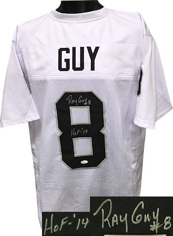 Ray Guy was a punter for the Oakland/Los Angeles Raiders. Coming from University of Southern Mississippi, he was the only pure punter ever to be drafted in the first round of the NFL draft when the Oakland Raiders selected him in 1973. Guy was a key member of three Super Bowl-winning Raiders teams: Super Bowls XI, XV, and XVIII. Ray Guy Oakland Raiders signed White unlicensed custom-prostyle jersey with twill stitched nameplate and numbers with HOF 14 #8 inscription. JSA Hologram and Certificate of Authenticity. Size XL