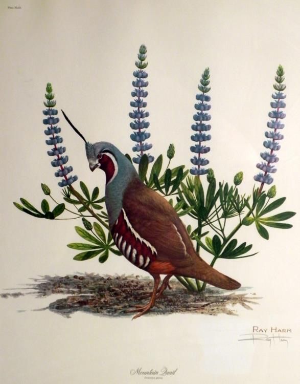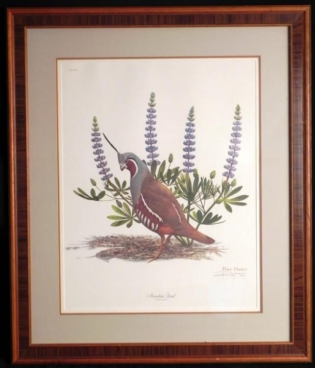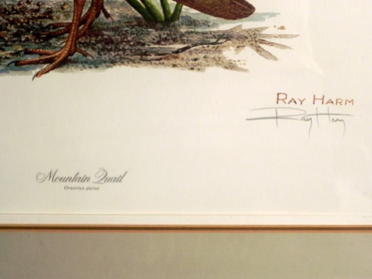 Offered here is this Ray Harm Limited Edition Framed Print.---Artist: Ray Harm--Title: Mountain QuailSignature: LRMedium: Print on paperEdition: Plate XLIXImage size: 15" x 19"Frame size:22.5" x 26.5"Presentation: Matted in an off white in a fairly simple wood frameCondition: Excellent, minor scratches on frame