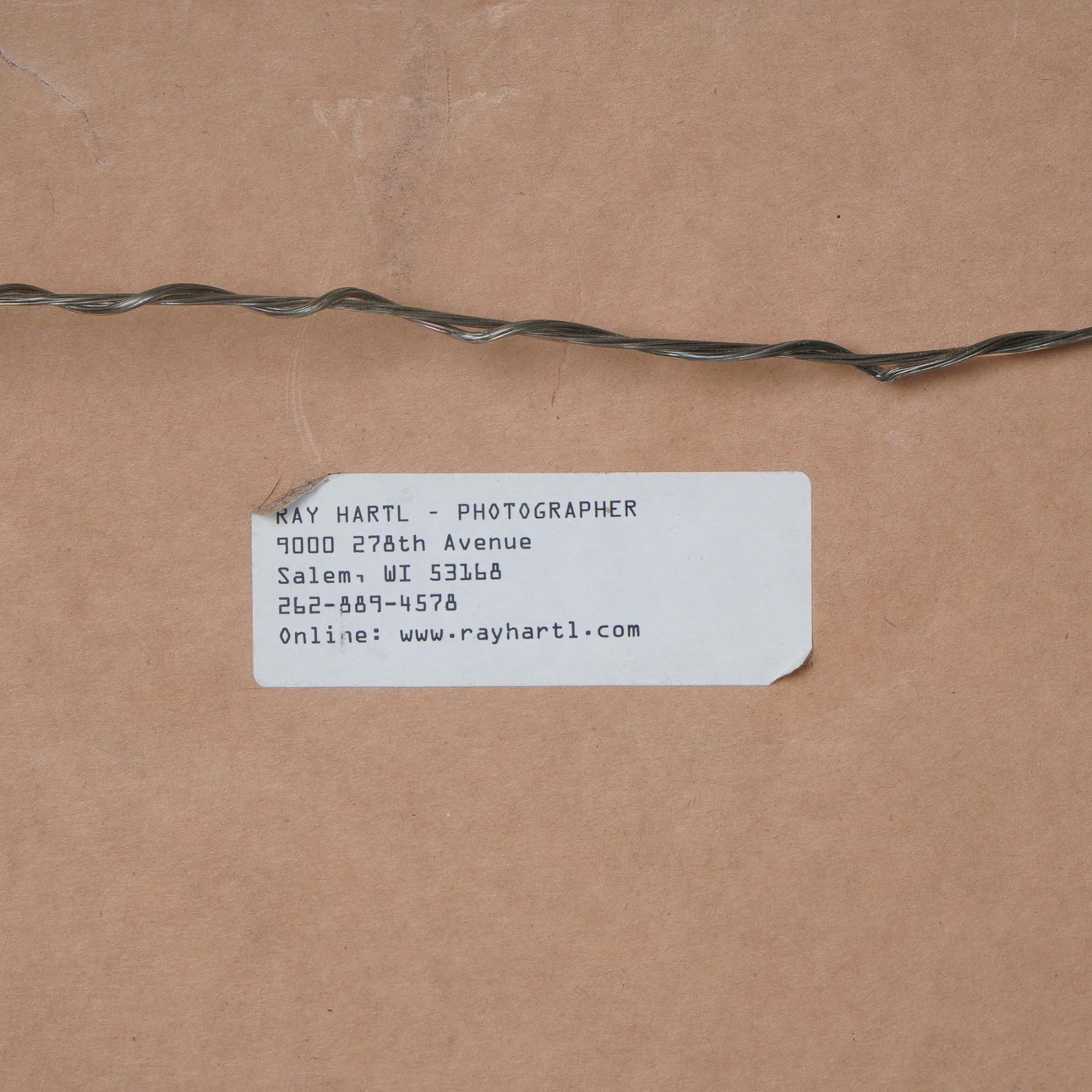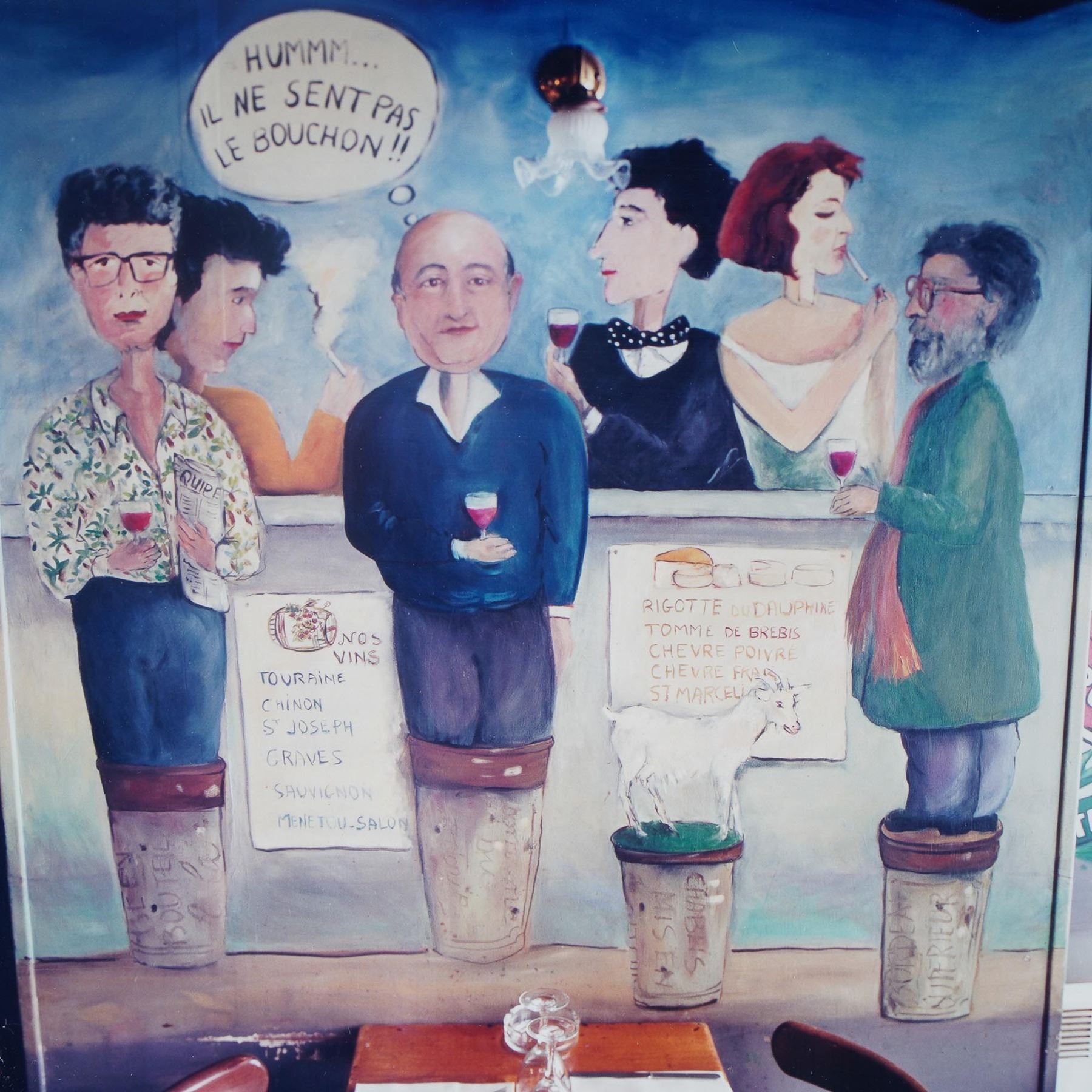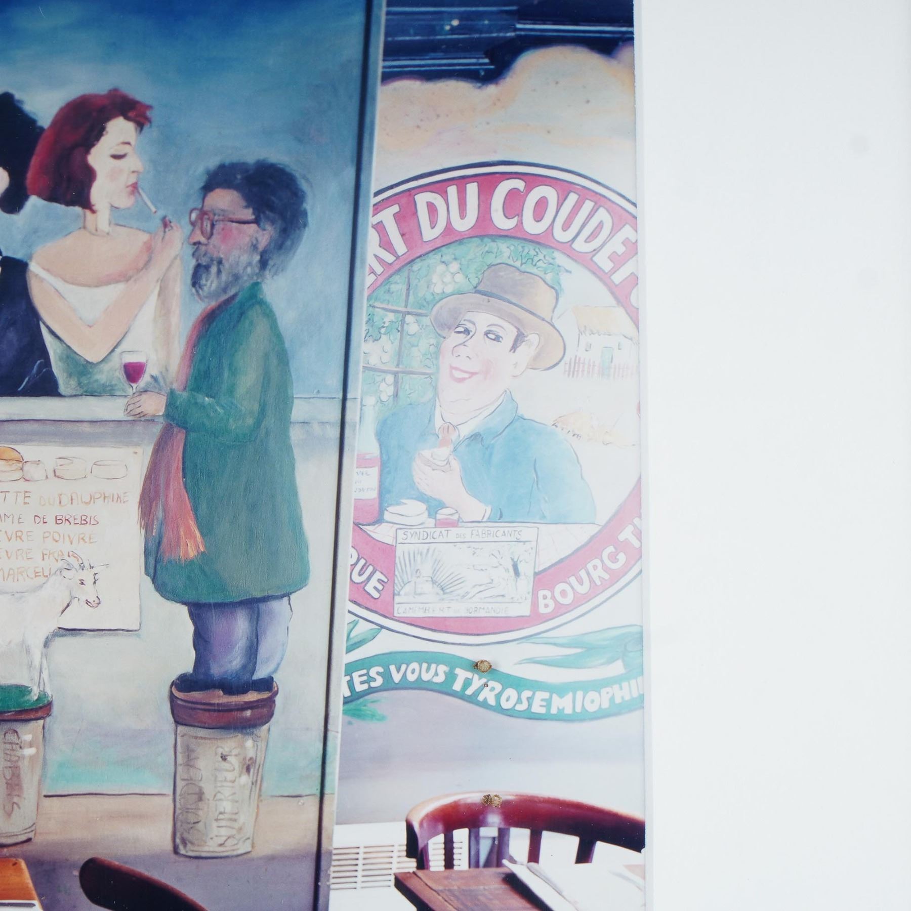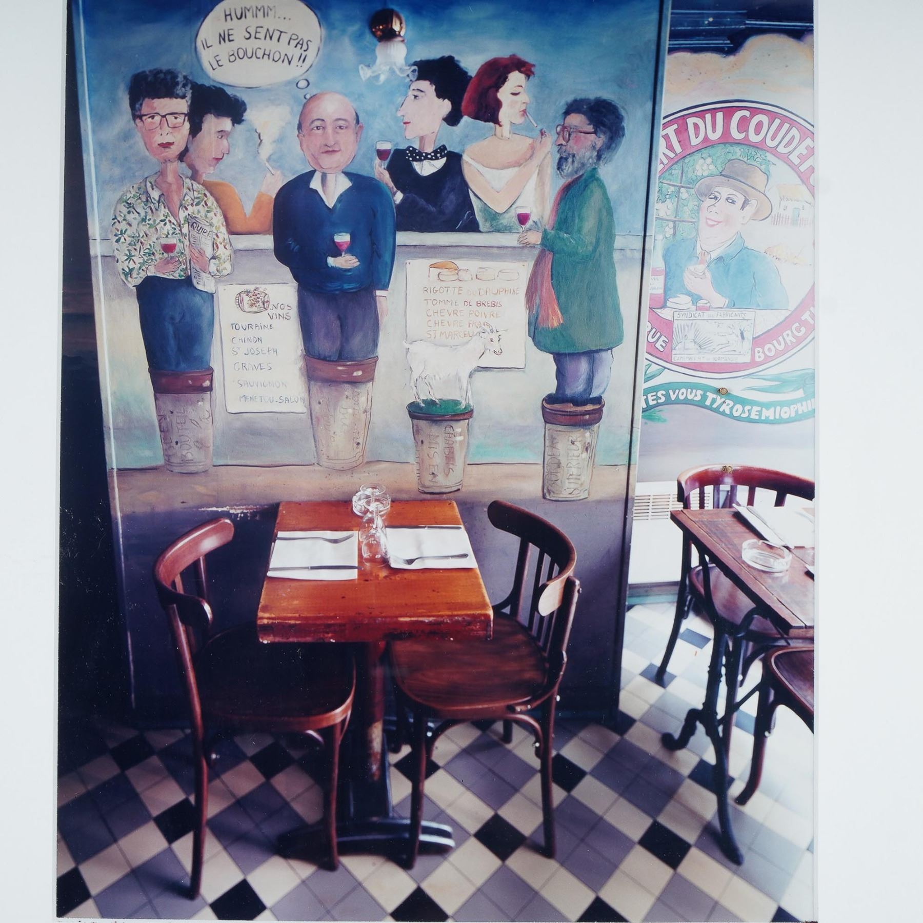 Framed color photograph by Ray Hartl depicting the interior of a French bistro, with a whimsical mural of diners painted on the wall. The image captures the intimate charm of cafe life, featuring checkered floors, wooden bistro chairs, and the suggestion of French wine culture. Signed in pencil by the artist on the mat. Photographer's label affixed to the reverse, indicating Ray Hartl of Salem, Wisconsin, with website and contact information.