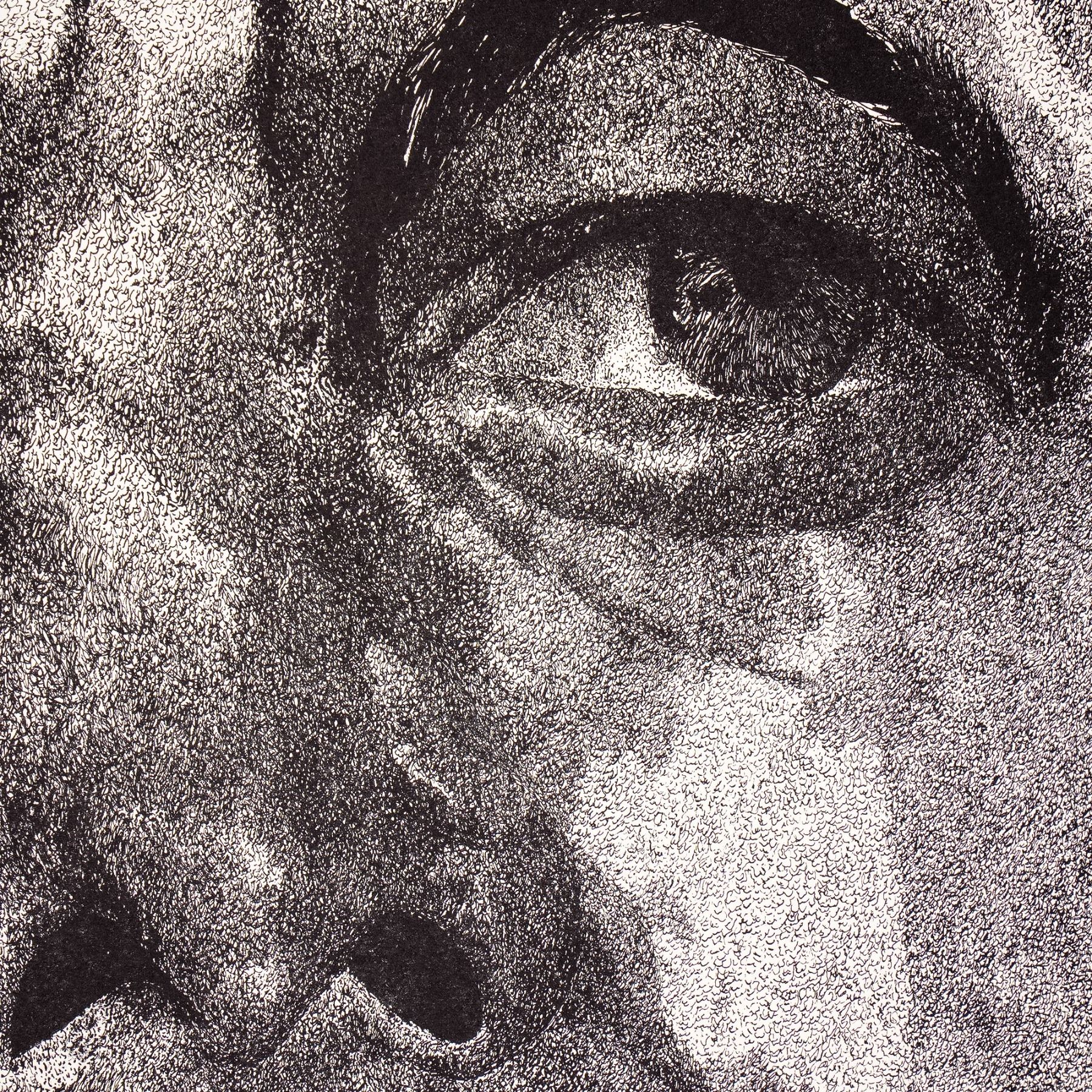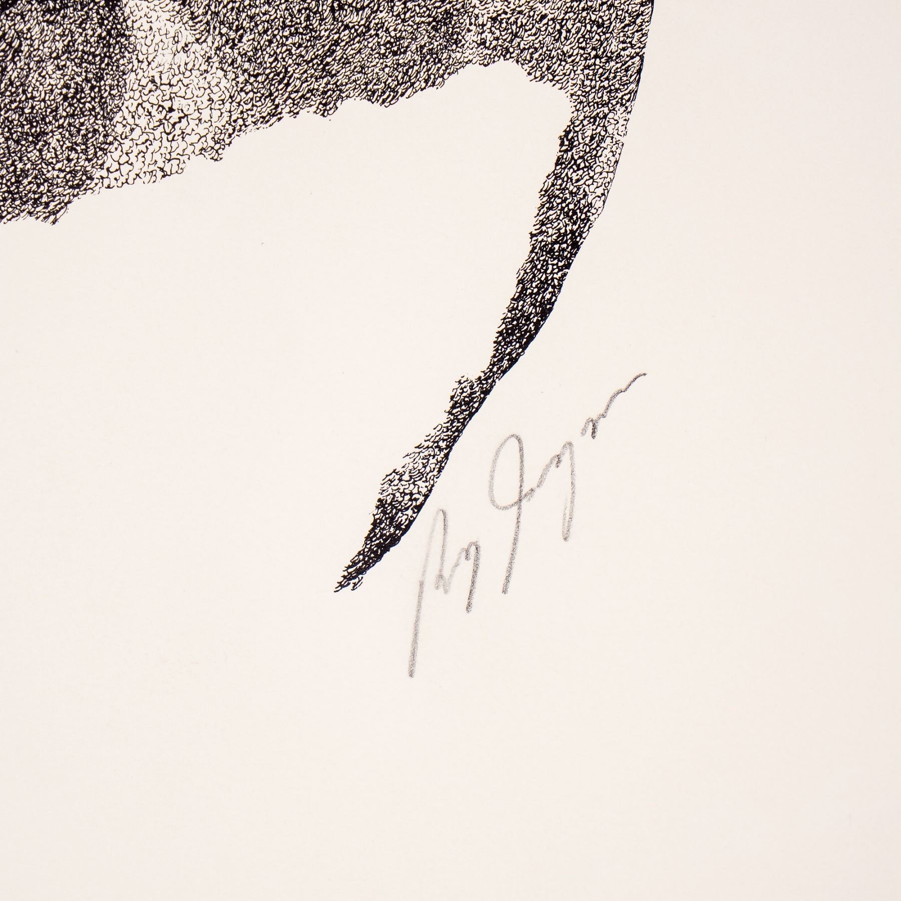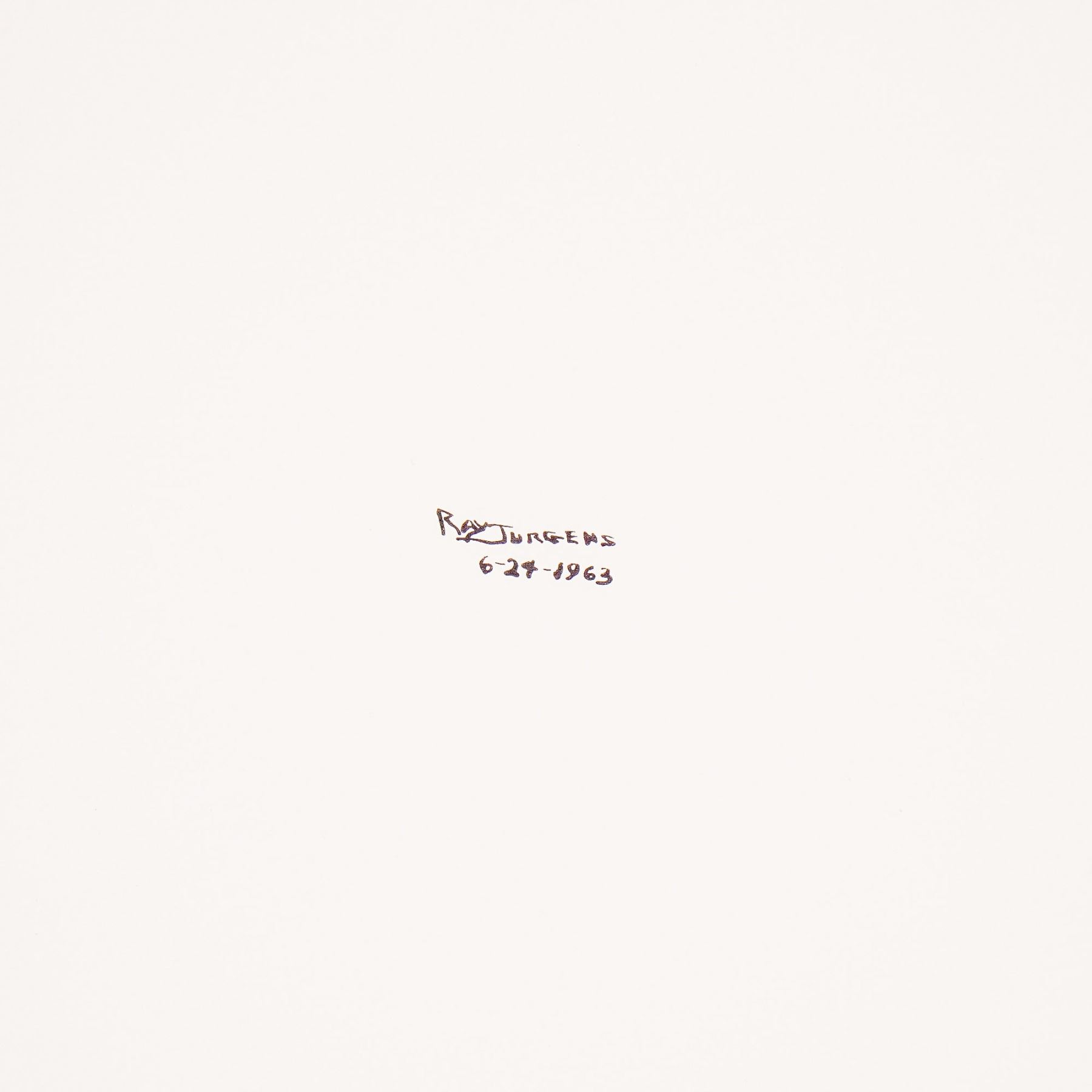 Executed with remarkable precision and emotional resonance, this lithograph by Ray Jurgens, dated June 27, 1963, presents a striking and intimate portrait of President John F. Kennedy. Rendered in exquisite detail through stippling and layered linework, the composition isolates the president's face, cropped dramatically to focus on his penetrating gaze and the quiet strength in his expression. The high-contrast technique imbues the portrait with depth and texture, capturing the complexity and charisma that defined Kennedy's presence during a pivotal era in American history. Created just months before his assassination, this work is not only a masterful example of mid-century draftsmanship but also a poignant historical artifact. The delicacy of Jurgens' hand transforms ink into light and shadow, evoking the tension between idealism and burden so often associated with Kennedy's legacy. Signed and dated in the lower margin, the piece offers collectors a rare opportunity to acquire an early, meticulously executed portrait of one of the most iconic figures of the 20th century.