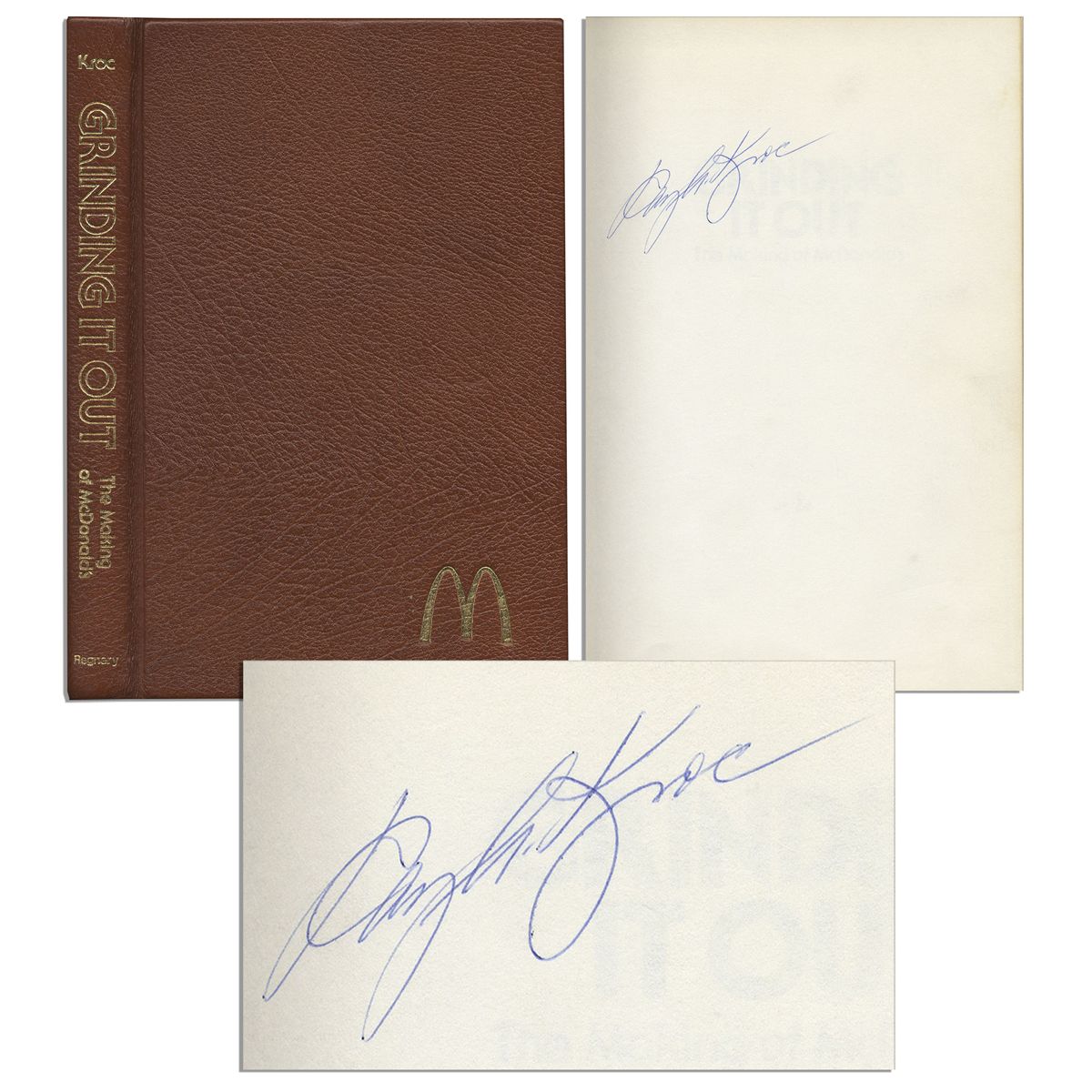 McDonald's visionary founder Ray Croc signed leather bound first edition of his book, ''Grinding It Out'', published by Henry Regnery Company: Chicago: 1977. Signed, ''Ray A. Kroc'' in blue ink on the front free endpaper. Book catalogs the founder's journey in building the biggest fast food chain empire in history. Runs 201pp. Bound in terra cotta leather boards with all edges gilt, gilt lettering to spine and gilt golden arches to front board. Measures 6.25'' x 9.25''. Light diagonal line to front pastedown and tiny nick to gilt on top edge. Near fine overall.