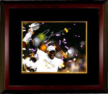 Ray Lewis played his entire 17-year career for the Baltimore Ravens. Drafted by the Ravens in 1996, Lewis was the last player remaining from the inaugural team at the start of the 2012–13 season. Playing middle linebacker his entire career, Lewis is considered one of the greatest ever to play the position. Lewis was selected to 13 Pro Bowls and named an Associated Press All-Pro 10 times. He is also thought to be the greatest Baltimore Ravens player of all time. He won the NFL Defensive Player of the Year in 2000 and 2003, becoming the sixth player to win the award multiple times. Lewis was also the second linebacker to win the Super Bowl Most Valuable Player Award and the first to win the award on the winning Super Bowl team. After a triceps tear that sidelined him for most of the 2012–13 season, Lewis returned for the Ravens playoff run and a victory in Super Bowl XLVII. Ray Lewis has signed this Baltimore Ravens 8x10 SBXLVII Photo. Certificate of Authenticity from Athlon Sports. Custom Black Mat and Premium Mahogany Frame as shown.