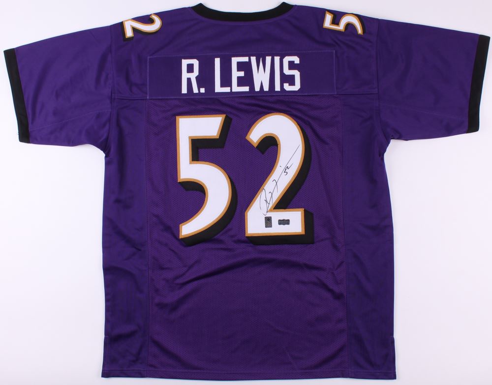 Custom on-field style jersey. Everything is sewn on, size XL. Hand-signed and inscribed in black felt-tip pen by Ray Lewis.