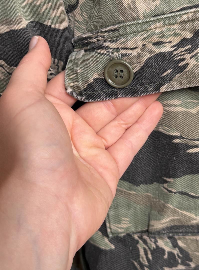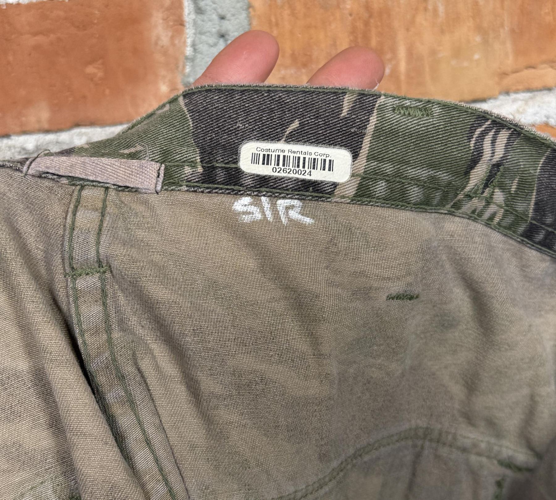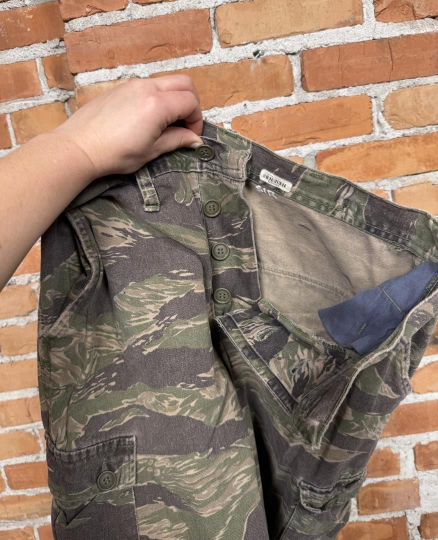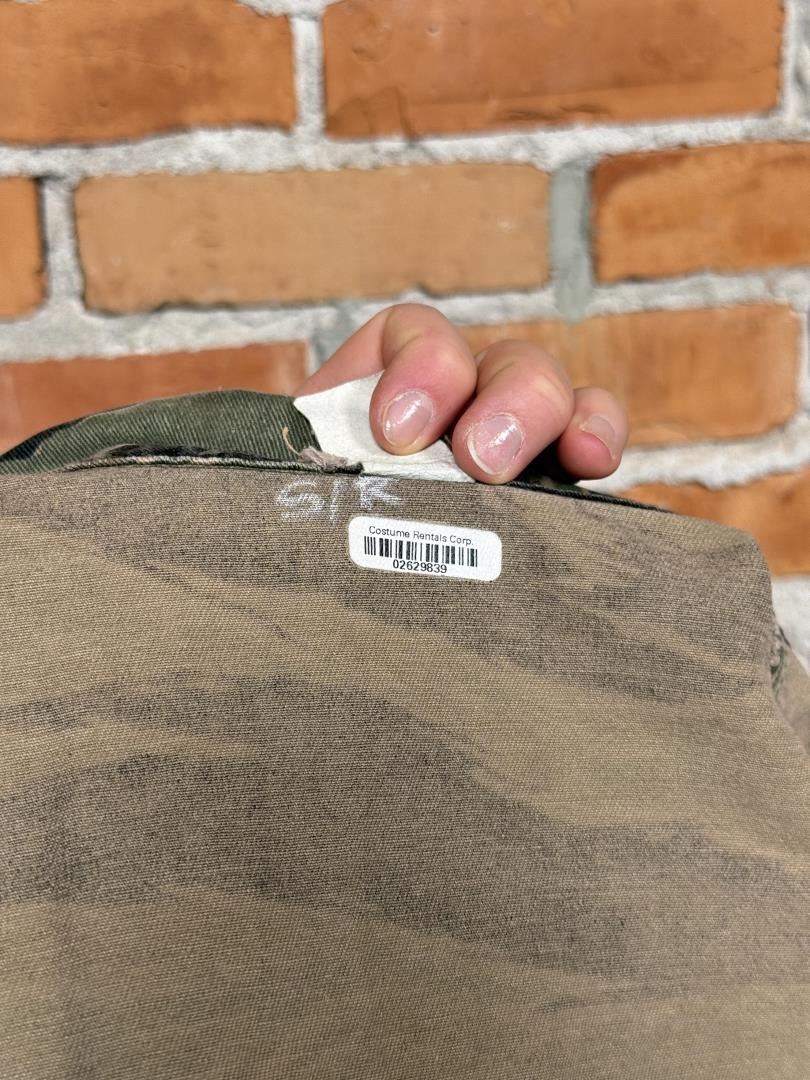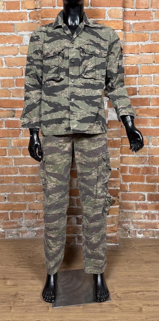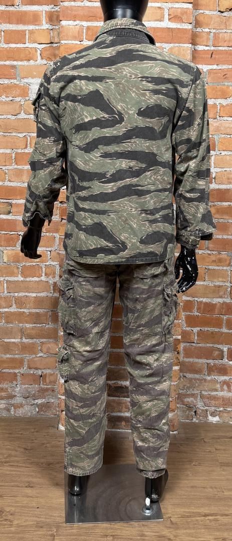 Tiger stripe set made for lead actor Ray Liotas stunt double. Featured in Operation Dumbo Drop (1997). 22" waist, 31" inseam pants. Jacket is size small.