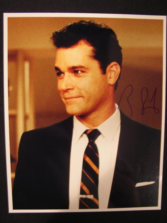 8 x 10 color photo of actor Ray Liotta, signed by him in blue felt pen. Liotta, most famous for his role as Henry Hill in Goodfellas (1990), is seen wearing a suit and looking off to the side. Includes a certificate of authenticity. (8x10)