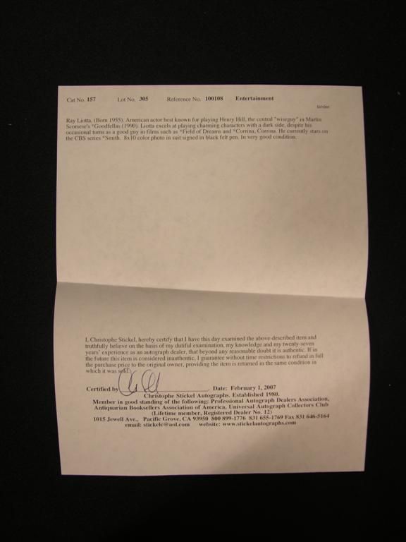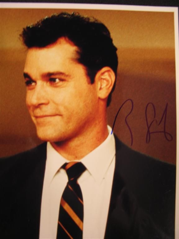 8 x 10 color photo of actor Ray Liotta, signed by him in blue felt pen. Liotta, most famous for his role as Henry Hill in Goodfellas (1990), is seen wearing a suit and looking off to the side. Includes a certificate of authenticity. (8x10)