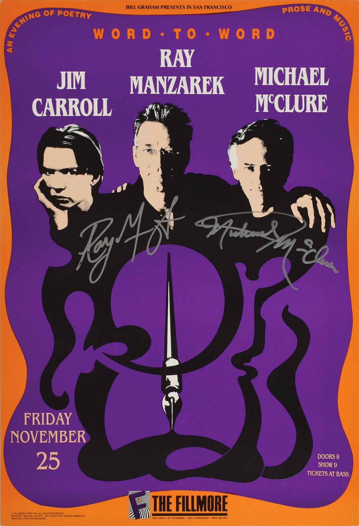 Original color 13 x 19.5 first printing poster for a "Word to Word" evening of poetry with Jim Carroll, Ray Manzarek, and Michael McClure at the Fillmore in San Francisco on November 25, 1988, signed in silver ink by Manzarek and McClure. In fine condition.