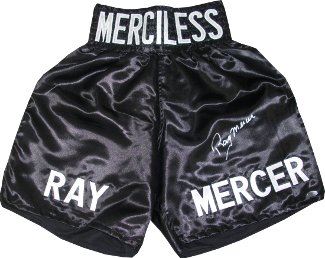 Merciless Ray Mercer is an American professional boxer, former Olympic 1988 Seoul Olympic Gold Medalist and WBO heavyweight title holder. He has also competed in kickboxing and mixed martial arts. Ray Mercer has hand signed these black satin boxing trunks. Leaf Hologram and Certificate of Authenticity from Athlon Sports.