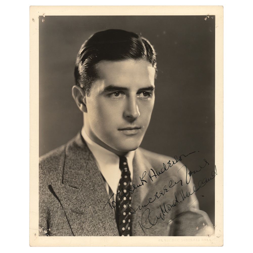 Handsome vintage glossy 8 x 10 photo of Milland early in his career, signed and inscribed in fountain pen, "To Frank Anderson, Sincerely Yours, Ramyond Milland.” Blindstamped by Clarence Sinclair Bull in the lower border, and bears his MGM credit stamp on the reverse. In very good condition, with multiple tack holes to each corner, scattered surface impressions, and horizontal crazing touching Milland's hair and signature area. A particularly early portrait of the actor, boasting an unusual full signature.