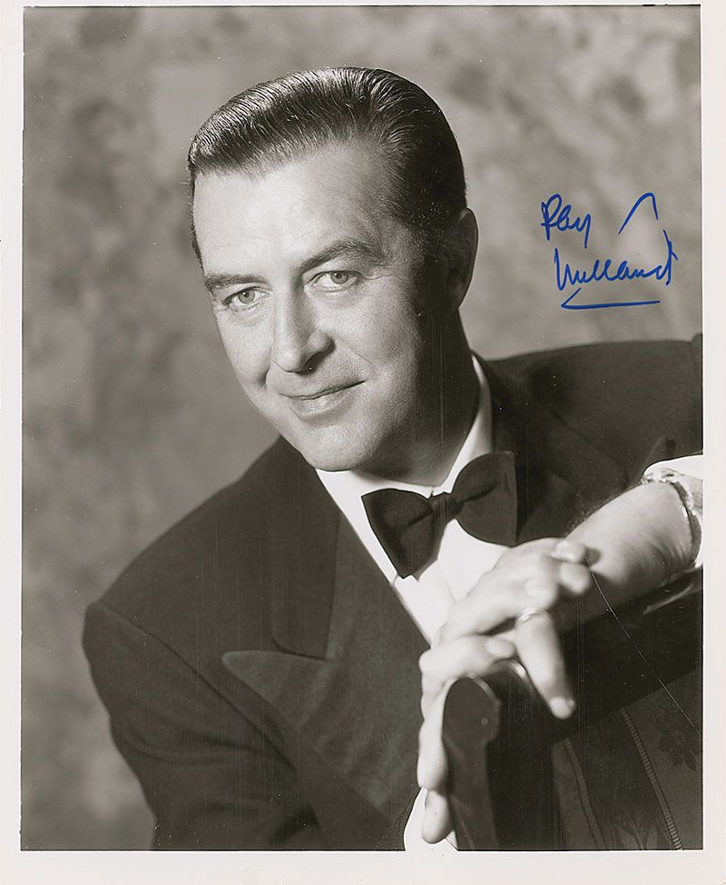 Glossy 8 x 10 photo of Milland in a tuxedo, signed in blue felt tip. In fine condition, with a bit of light vertical streaking to finish.