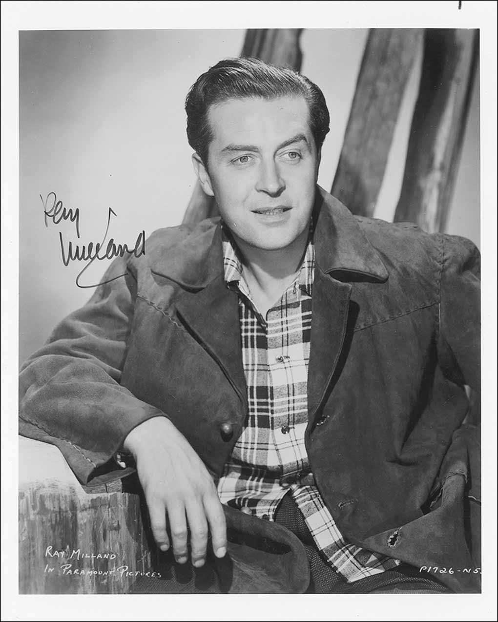 Glossy 8 x 10 Paramount publicity photo of Milland in a flannel shirt and jacket, signed in black felt tip. In very fine condition.