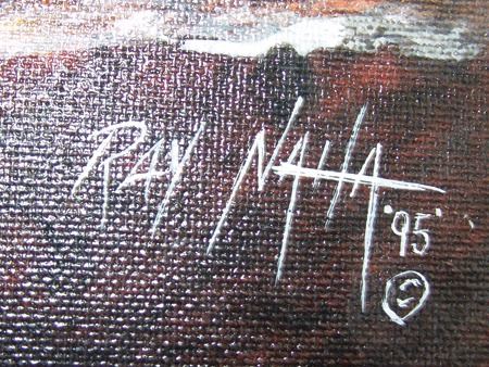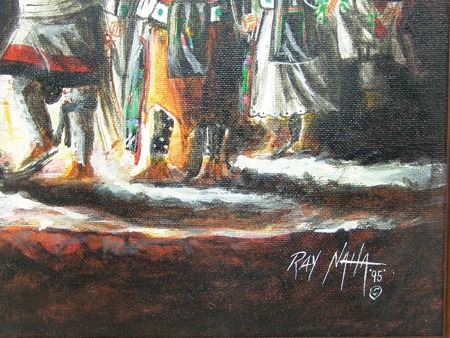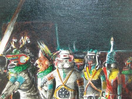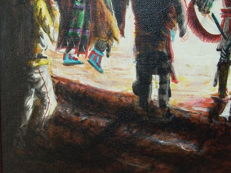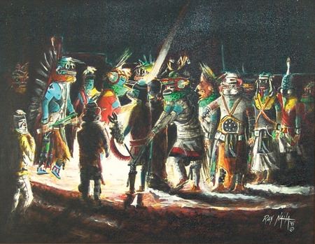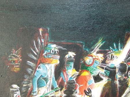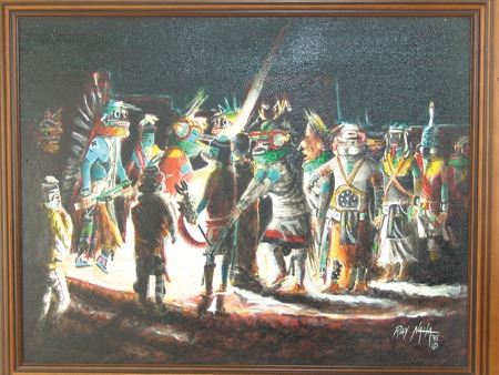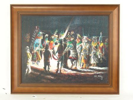 Ca. 1995, Beautiful signed original oil on canvas depicting a nght ceremony at the Pueblo. (A sister to the previous lot #71.) 13-1/2" x 17-1/2" (18-1/4" x 22-1/4" fr)