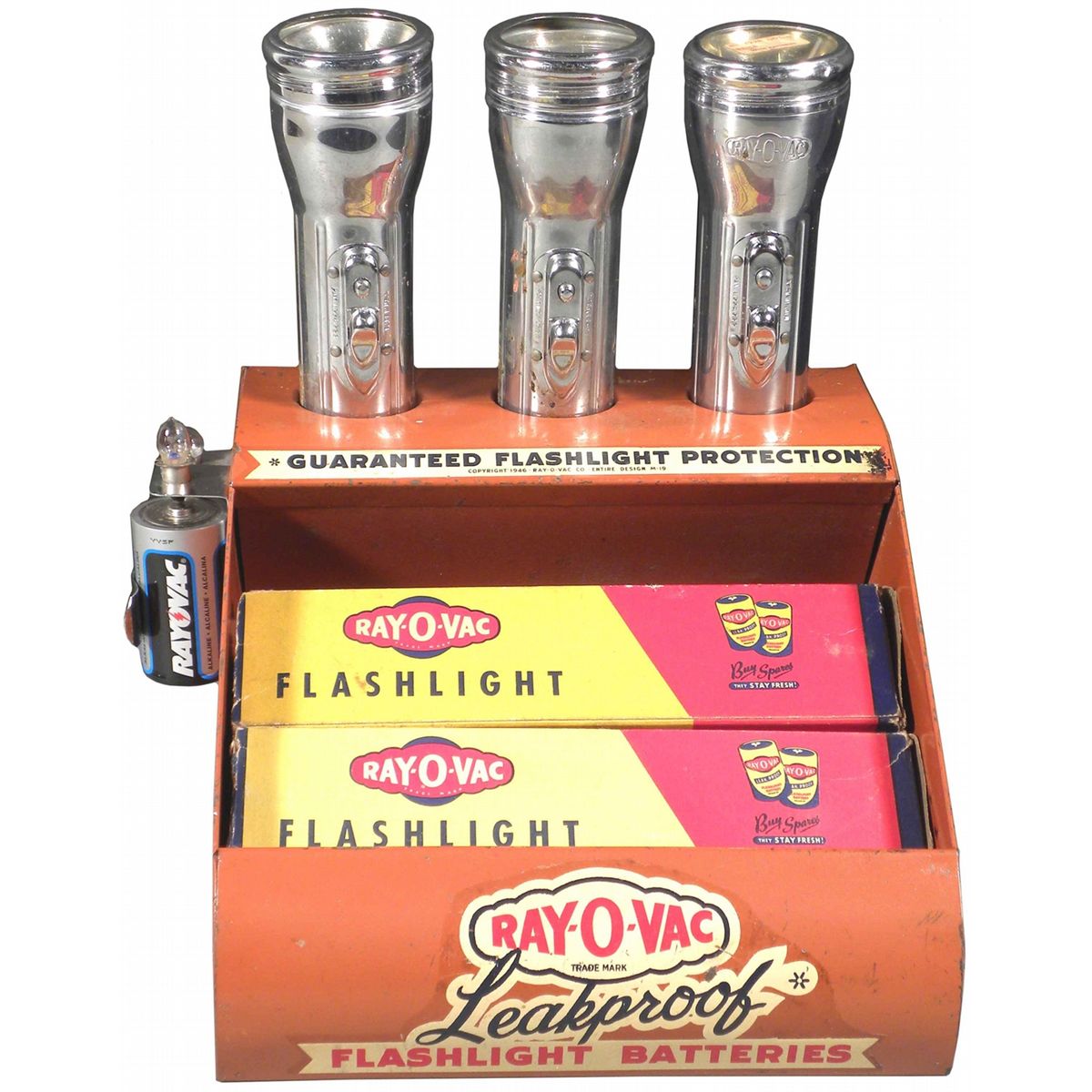 Ray-O-Vac Leakproof Flashlight Batteries Display. Comes with 3 flashlights and 2 boxes. Very good condition. 8 1/2 X 10 1/2 X 9 inches.