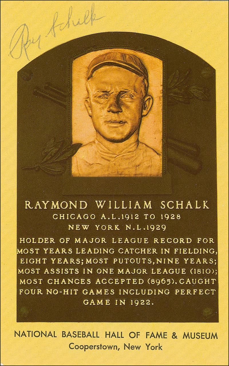 One of the premier catchers of his day. He caught a Major League record four no-hitters in his career, including two in May 1914 and Charlie Robertson’s perfect game April 30, 1922. Rare gold Hall of Fame plaque card signed at the top in blue ballpoint. In fine condition.