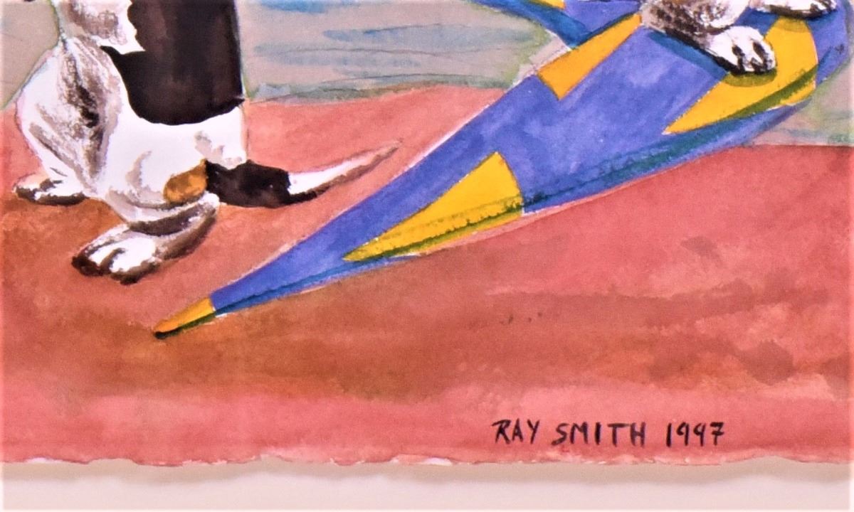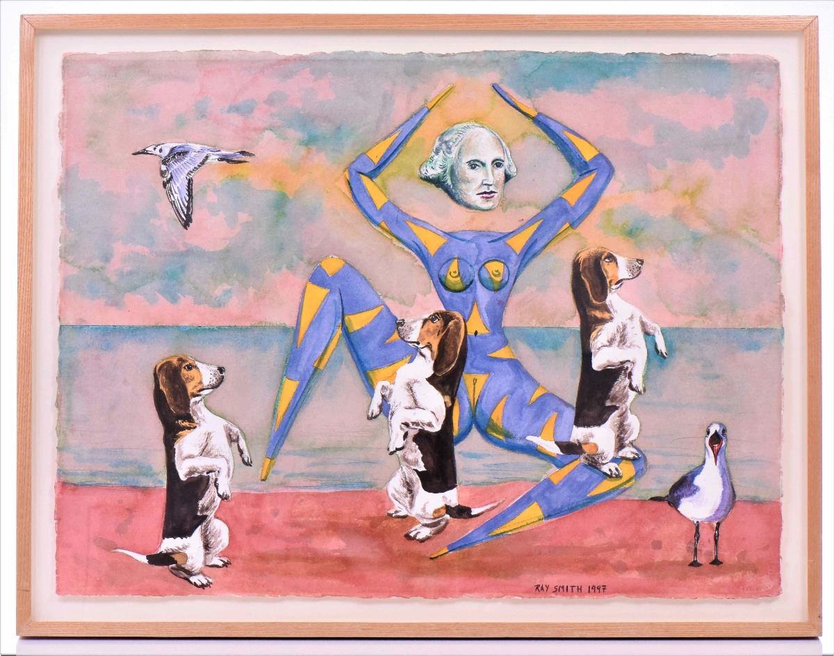 Ray Smith (1959), original drawing-water color depicting George Washington, signed "Ray Smith 1997". This artist has auction records at Sotheby's and Christies in upwards of $60,000 where all records are listed on Artprice.com in Paris. Size: 33.5 in x 26 in. Estimated more than 50 yrs old. American art is visual art and started with colonial art on the East Coast where artists initially relied on Europe trends. In the late 18th and early 19th centuries, artists primarily painted portraits, and some landscapes in a style based mainly on English painting. Furniture-makers imitating English styles and similar craftsmen were also established in the major cities, but in the English colonies, locally made pottery remained resolutely utilitarian until the 19th century, with fancy products imported. But in the later 18th century Americans gave the first sign of an emerging force in Western art. In the early 19th century the infrastructure to train artists who began to produce Romantic paintings of American landscapes. The American Revolution produced a demand for patriotic art, especially history painting, while other artists recorded the frontier country. A parallel development taking shape in rural America was the American craft movement, which began as a reaction to the industrial revolution. After World War II, New York replaced Paris as the center of the art world. Since then many American movements have shaped Modern and Postmodern art. (Wikipedia) (Photos Represent The Condition Of The Lot.)