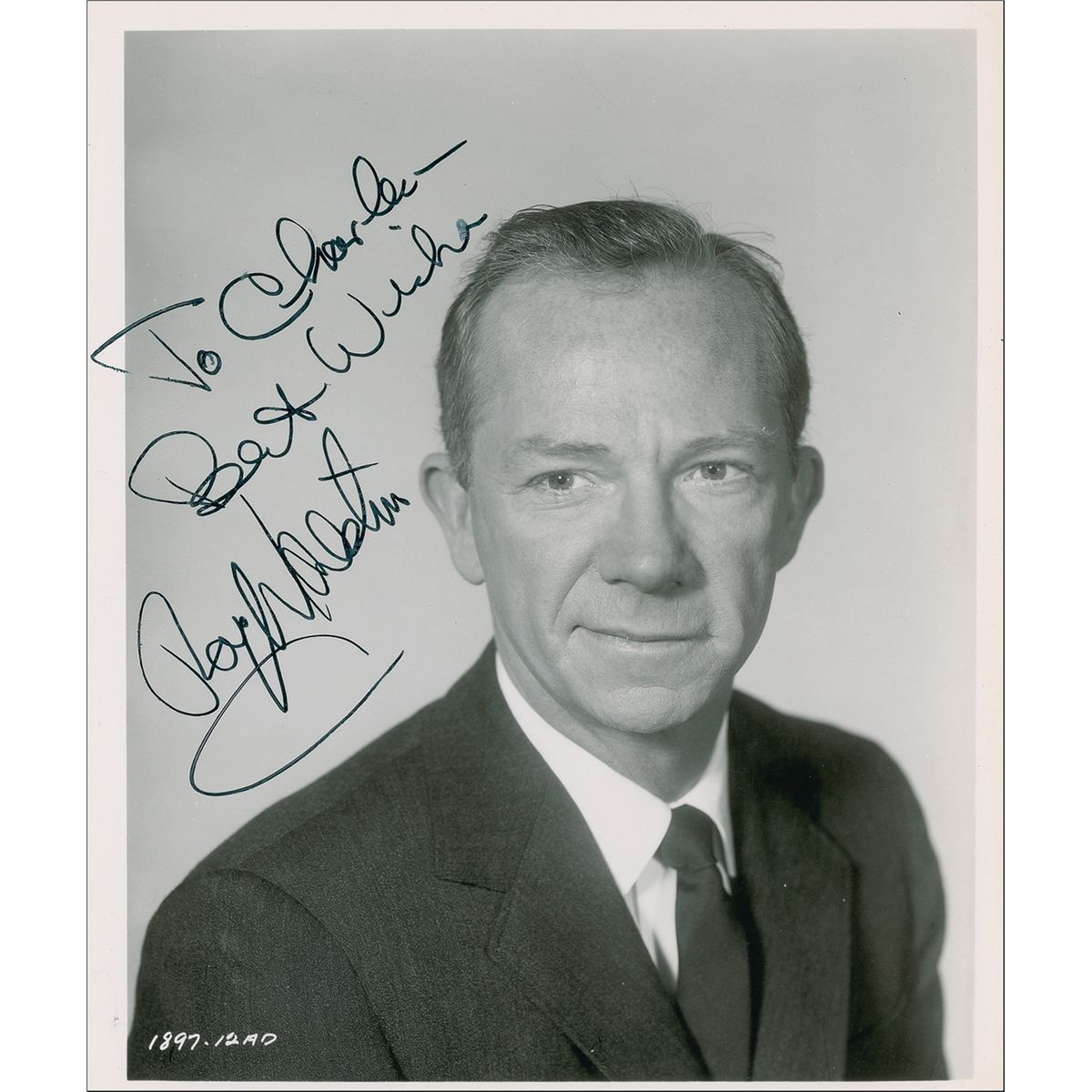 Glossy 8 x 10 head-and-shoulders photo, signed and inscribed in black ink “To Charlie—Best wishes, Ray Walston.” In fine condition.