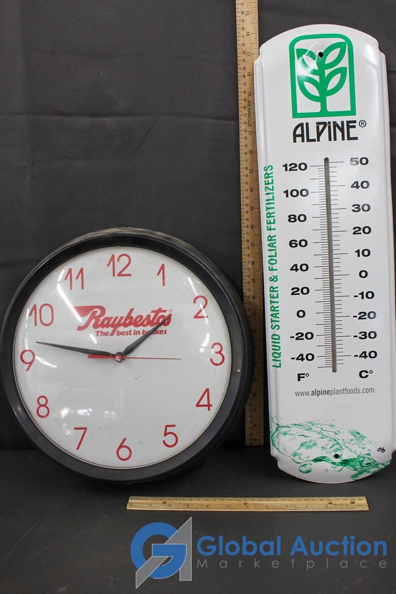 Raybestos Advertisment Clock & Alpine Plant Foods Advertisment Thermometer