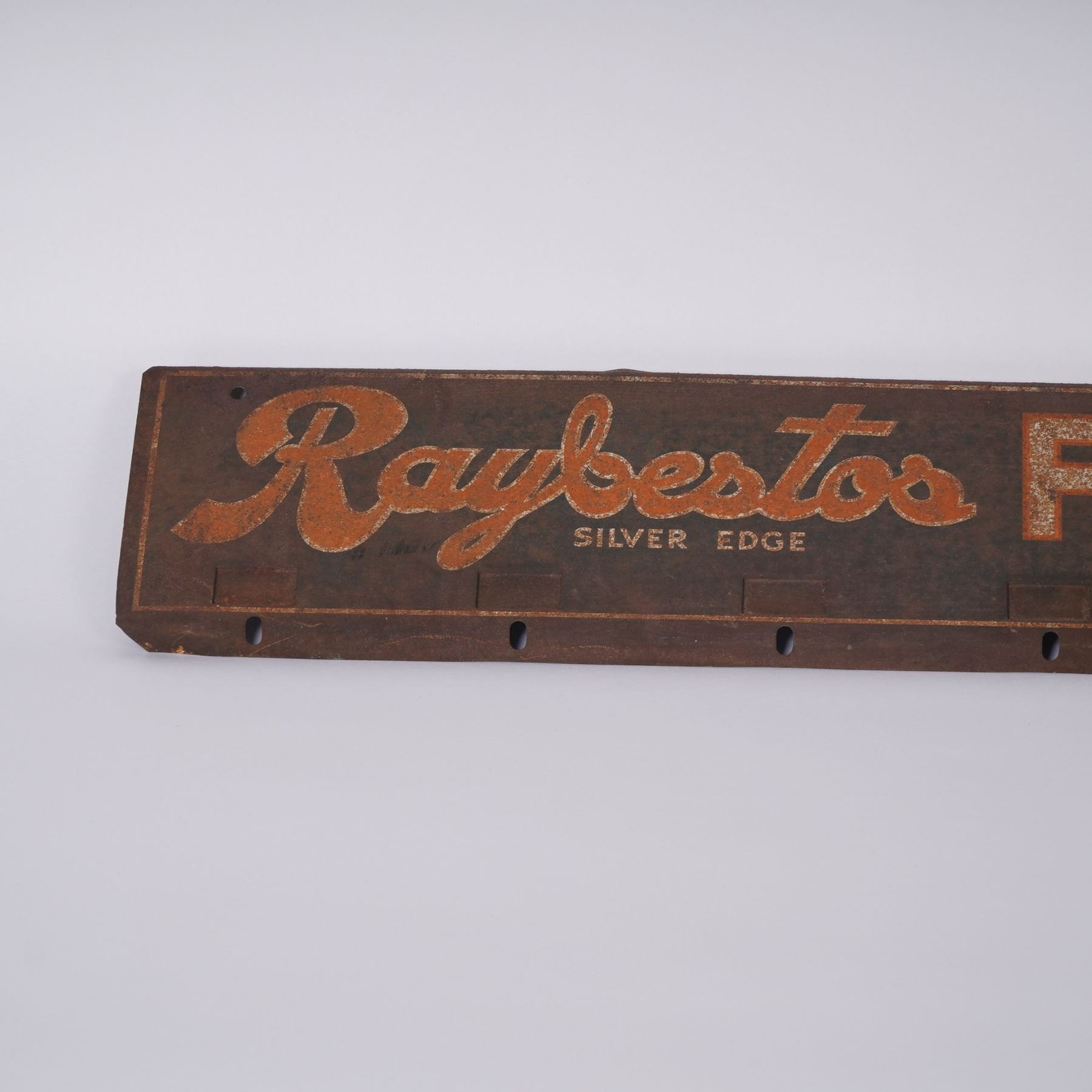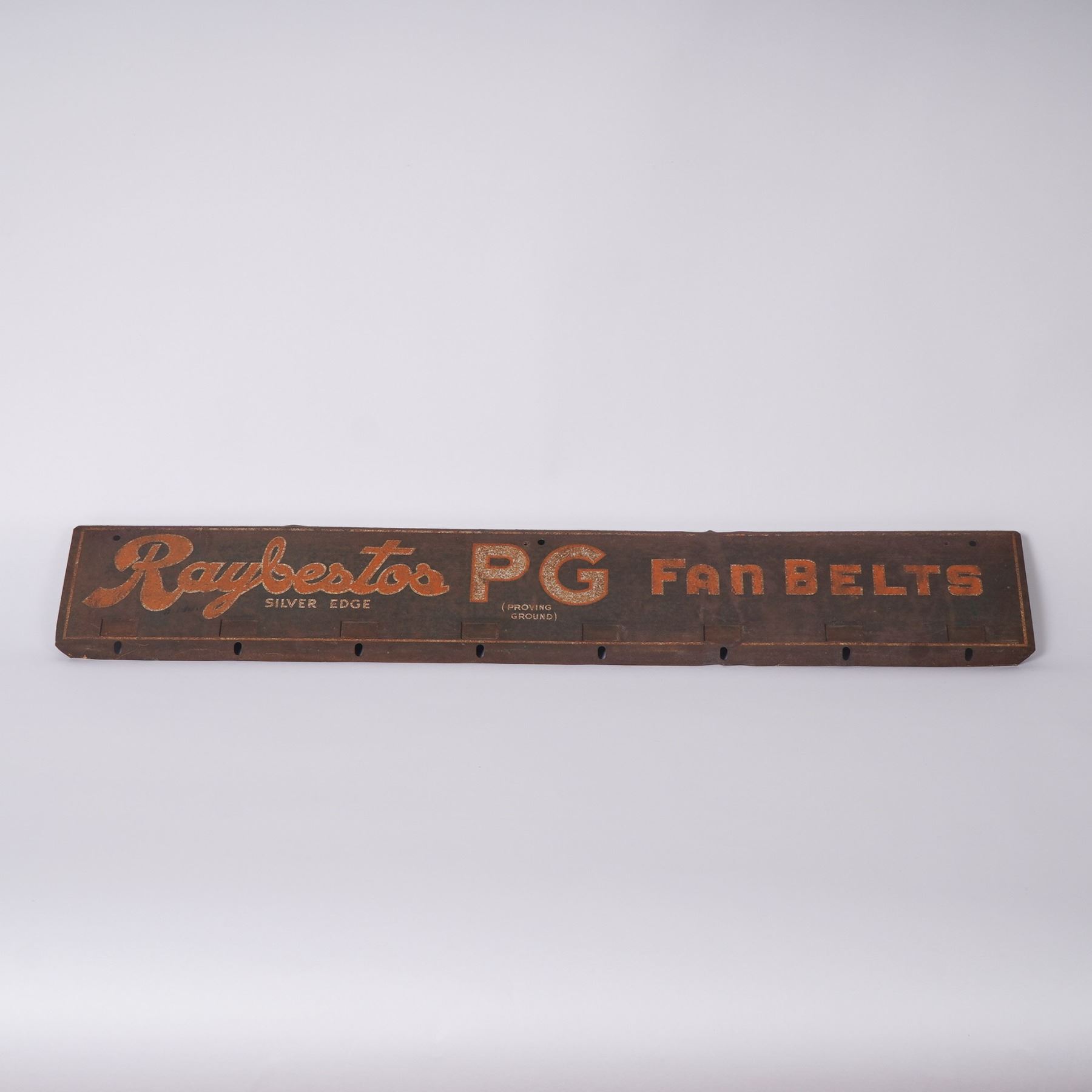 Vintage Raybestos PG Fan Belts advertising display sign, featuring bold stenciled lettering in orange-red and white against a black background. The sign reads Raybestos Silver Edge PG (Proving Ground) Fan Belts, and was designed to sit above or behind a row of product hooks, with metal tabs along the base for mounting or display. The patina and wear are consistent with authentic garage or service station use, adding to its nostalgic charm. A great piece of mid-century American automotive advertising.