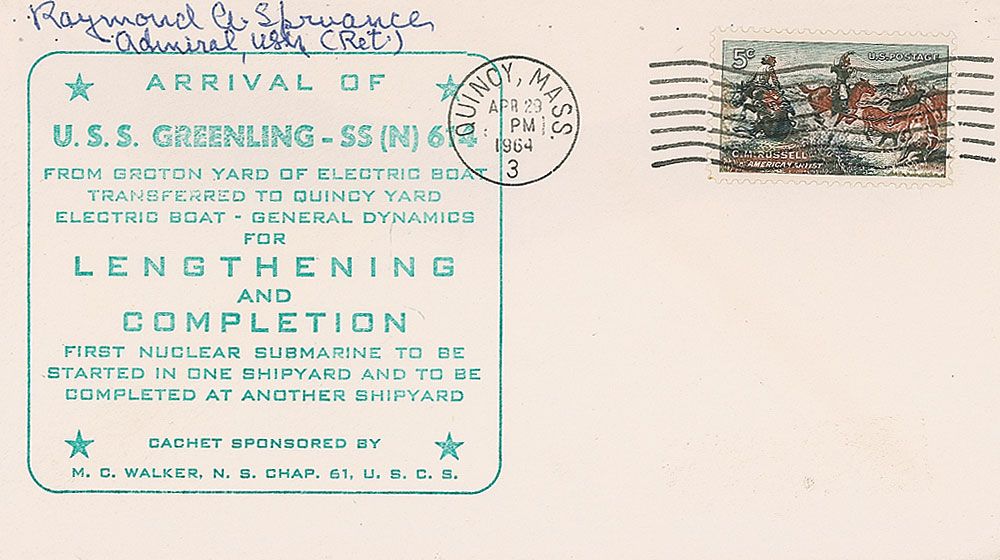 US Navy admiral during World War II (1886–1969) remembered for commanding forces during the Battle of Midway and the Battle of the Philippine Sea. Commemorative cover with a stamped cachet honoring the arrival of USS Greenling, signed in blue ballpoint, “Raymond A. Spruance, Admiral, USN (Ret).” In fine condition.