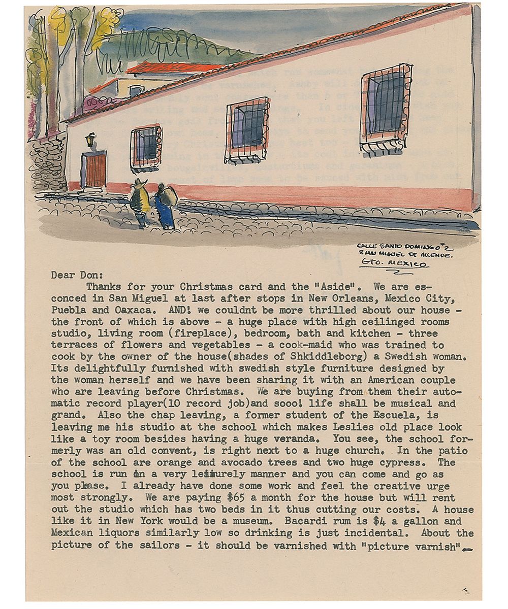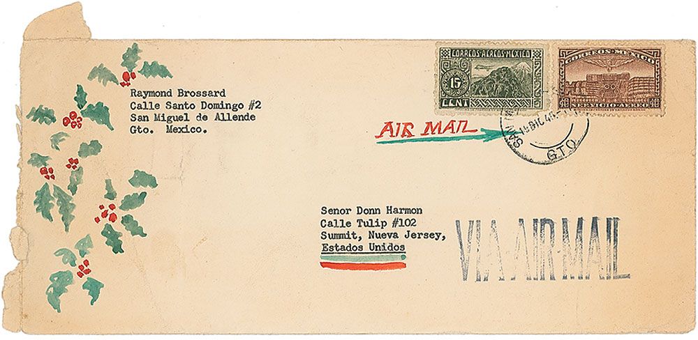 American artist (born 1915). TLS signed “Ray,” two pages on two adjoining sheets, 6.5 x 8.5, December 19, 1940. Letter to Donn Harmon. In part: “We are ensconced in San Miguel at last…AND! we couldn’t be more thrilled about our house—the front of which is above—a huge place with high ceilinged rooms, studio, living room (fireplace), bedroom…Its delightfully furnished with swedish style furniture…A house like it in New York would be a museum.” Brossard added a delightful watercolor painting of the house at the top of the page. In fine condition. Accompanied by the original mailing envelope, which Brossard also decorated with small watercolor paintings.