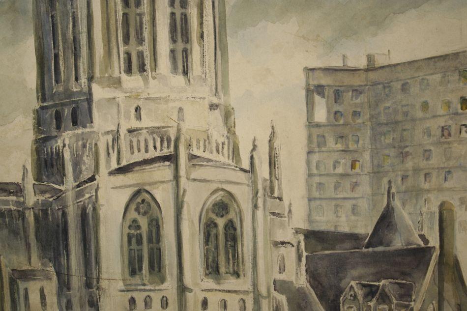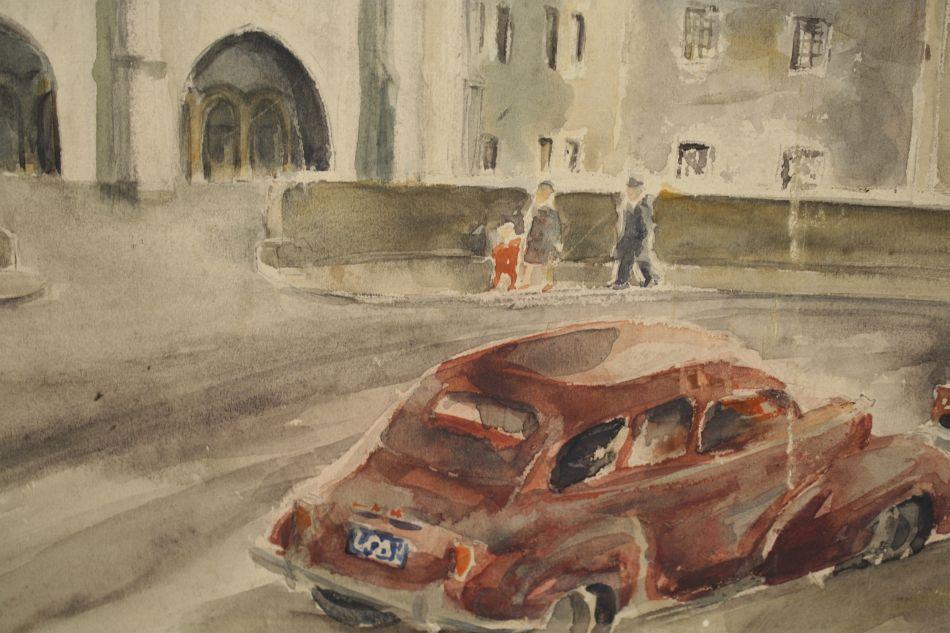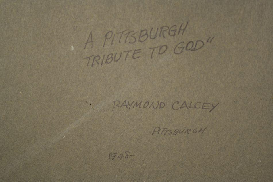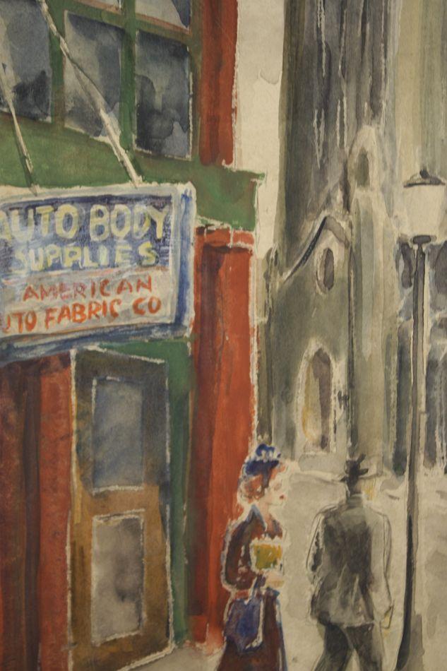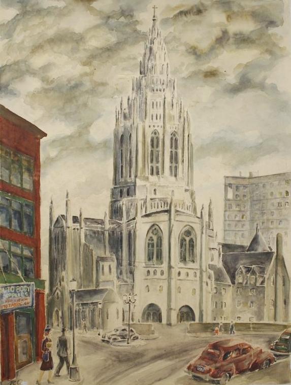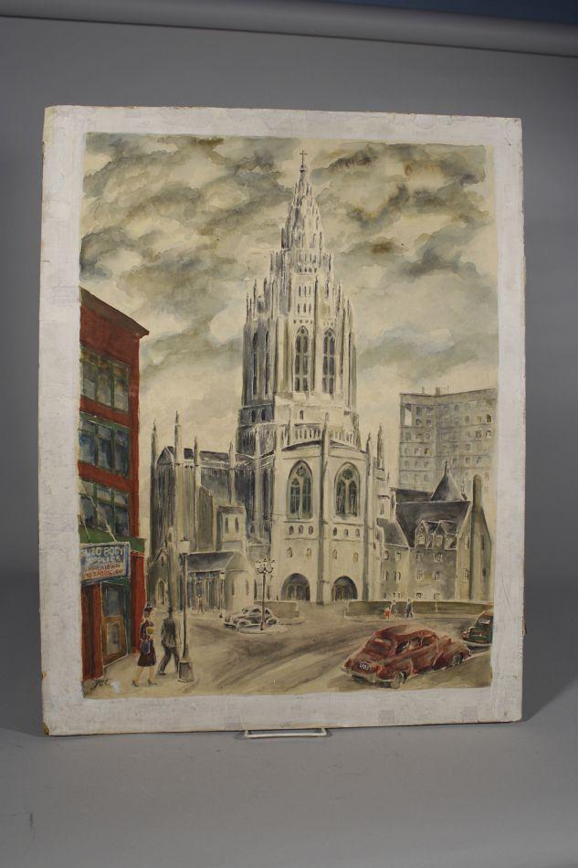 Raymond Calcey (American, 20th Century) Church in Pittsburgh Street Scene, Watercolor on board,